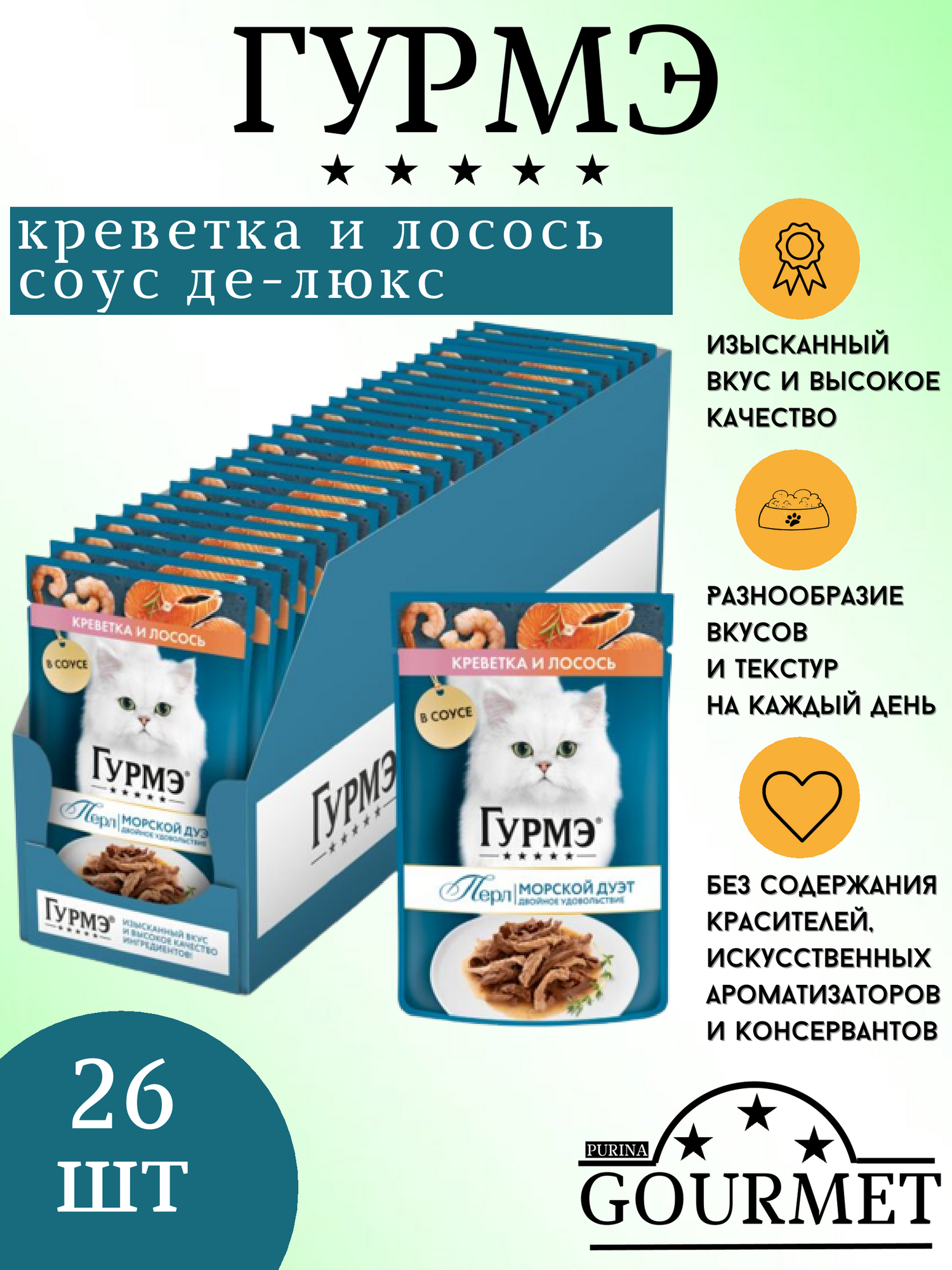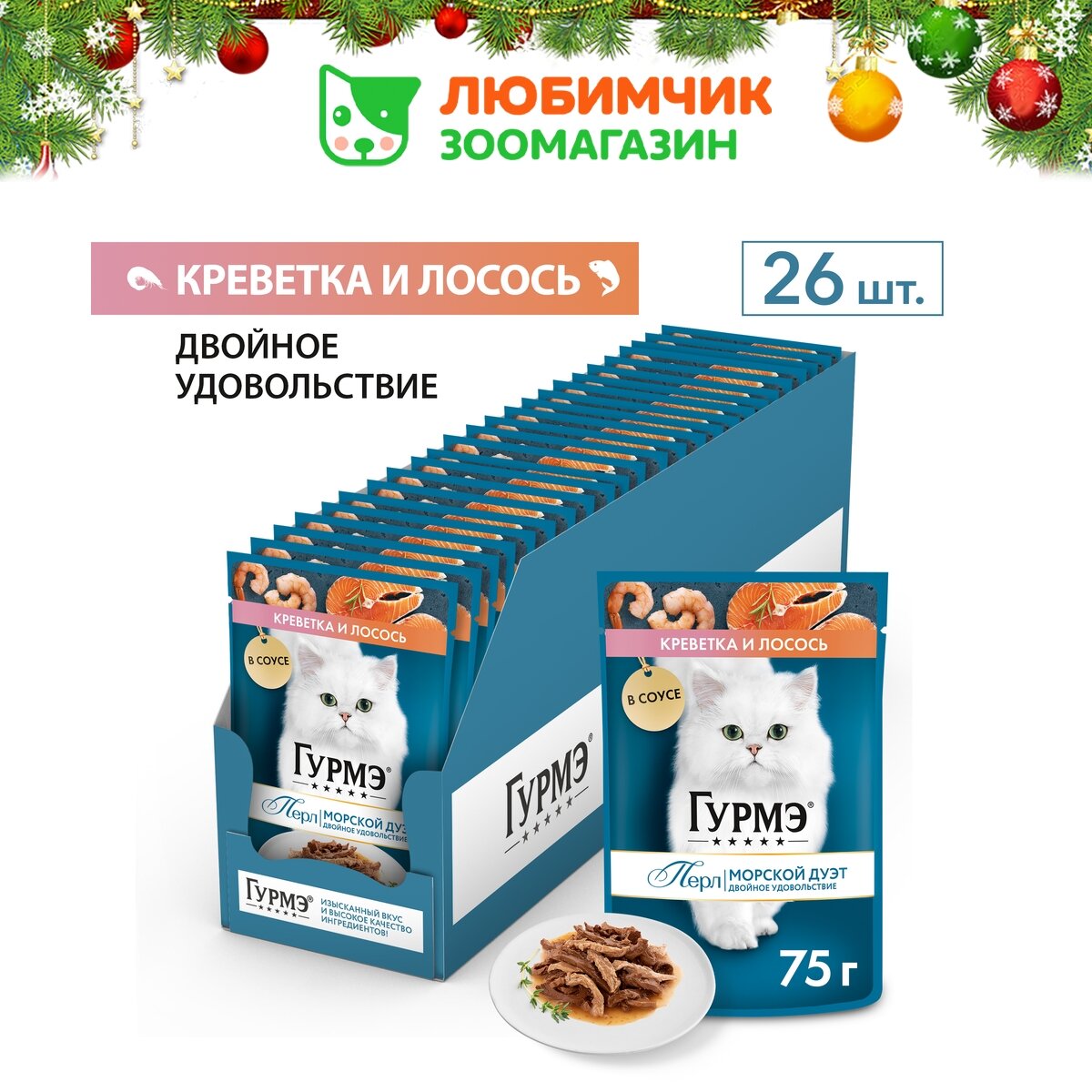 Купить Гурмэ Перл Морской Дуэт пауч для кошек (кусочки в соусе) Креветка и лосось, 75 г. упаковка 26 шт