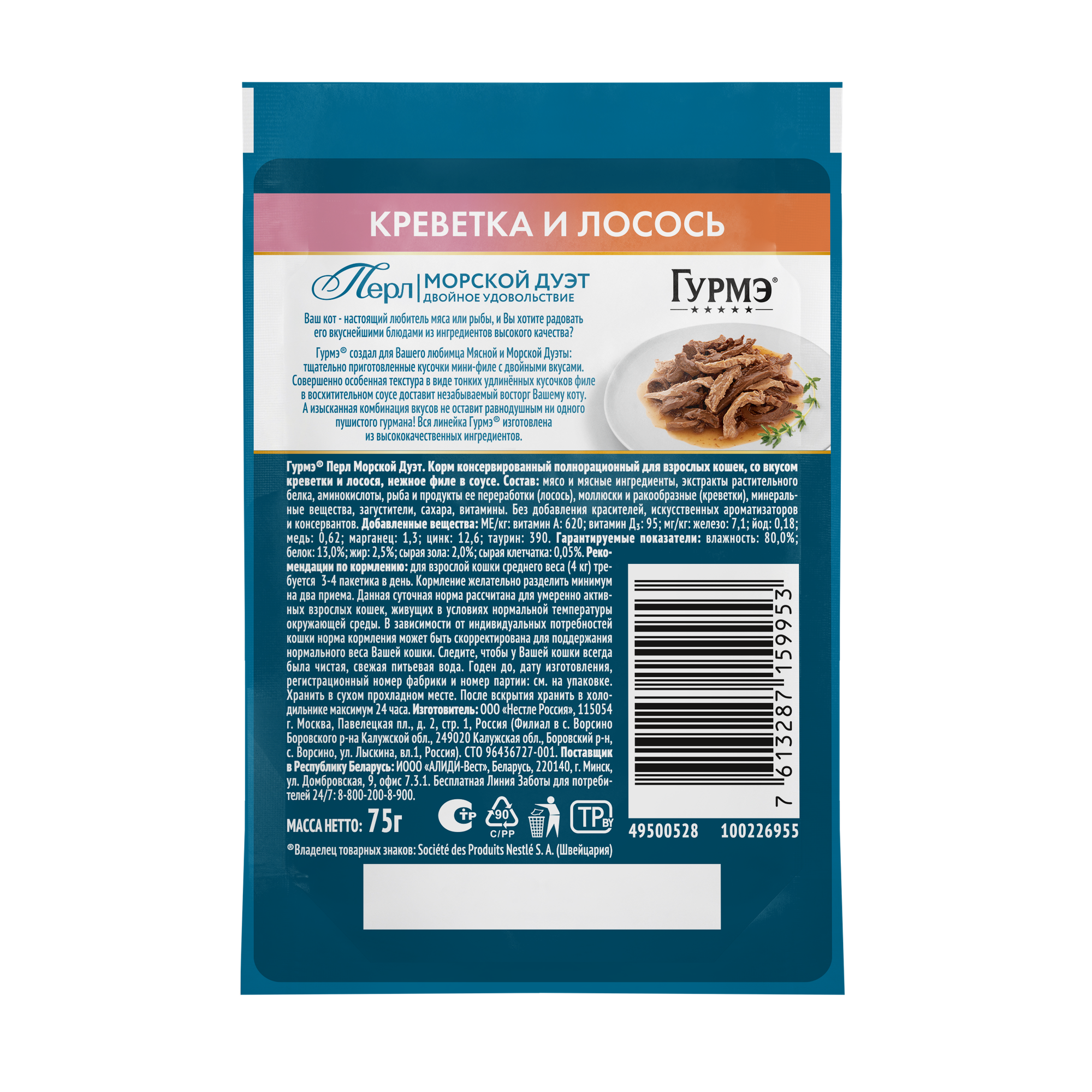 Гурмэ перл морской дуэт для взрослых кошек нежное филе с креветкой и лососем в соусе пауч 75 гр NEW 75 гр х 10 шт