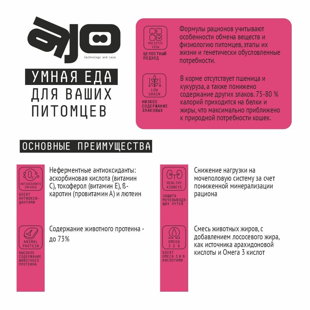 Сухой корм AJO (АЙО) Cat Sterile для активных стерилизованных кошек с высоким содержанием белка 400г*2шт