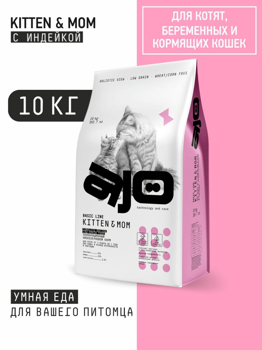 Сухой корм AJO Cat Kitten & Mom для котят, беременных и кормящих кошек, с индейкой, 10 кг
