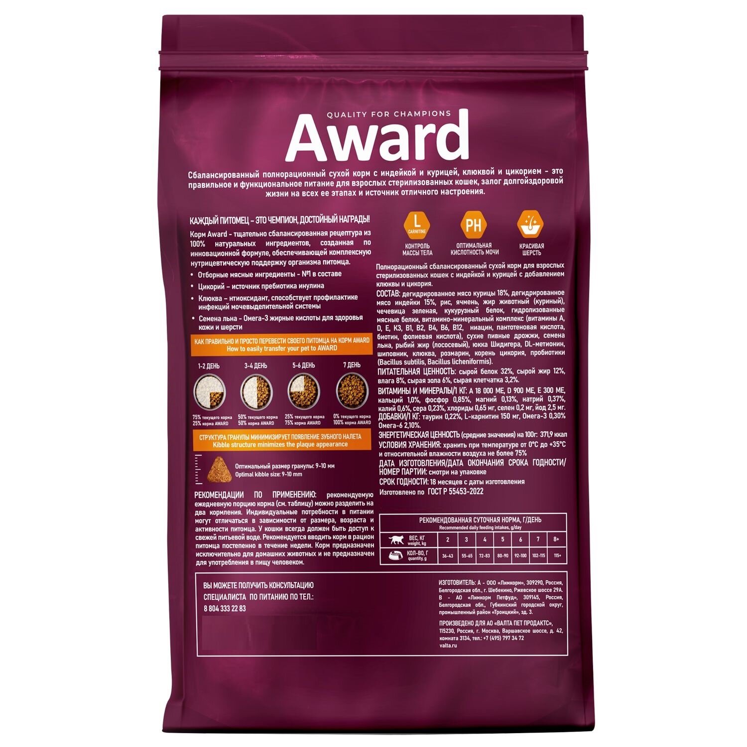 Ниже Вы можете прочитать отзывы на AWARD Сухой корм Sterilized для взрослых стерилизованных кошек с индейкой и курицей с добавлением клюквы и цикория 1,5кг, ознакомится с подробными характеристиками, посмотреть интересные обзоры и фотографии на AWARD Сухой корм Sterilized для взрослых стерилизованных кошек с индейкой и курицей с добавлением клюквы и цикория 1,5кг.