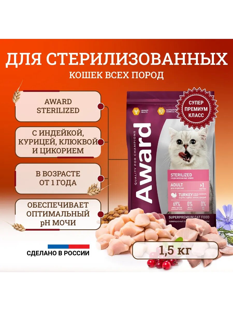 Сухой корм AWARD Sterilized для взрослых стерилизованных кошек с индейкой и курицей с добавлением клюквы и цикория 1,5кг