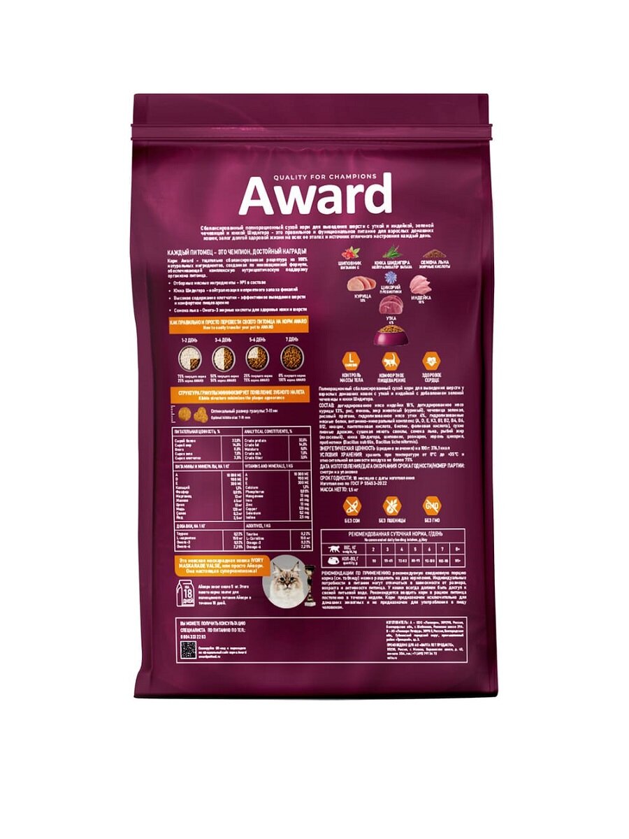 AWARD Hairball&Indoor Сухой корм для взрослых кошек для выведения шерсти с уткой и индейкой 1,5 кг