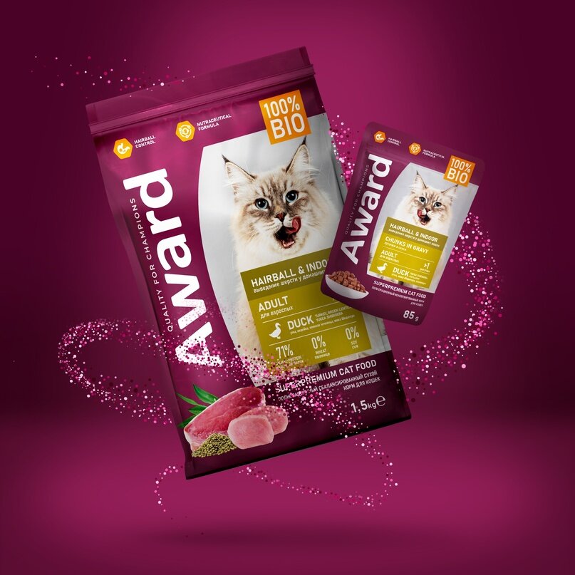 Сухой корм AWARD Hairball & Indoor для взрослых кошек для выведения шерсти с уткой и индейкой с добавлением зеленой чечевицы и Юкки Шидигера 1,5кг