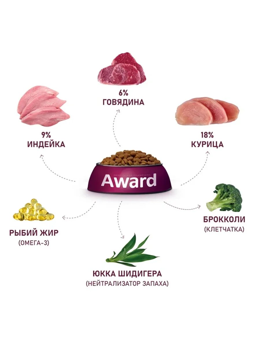 Сухой корм AWARD для взрослых домашних кошек крупных пород с говядиной , курицей, брокколи и юккой Шидигера 400г