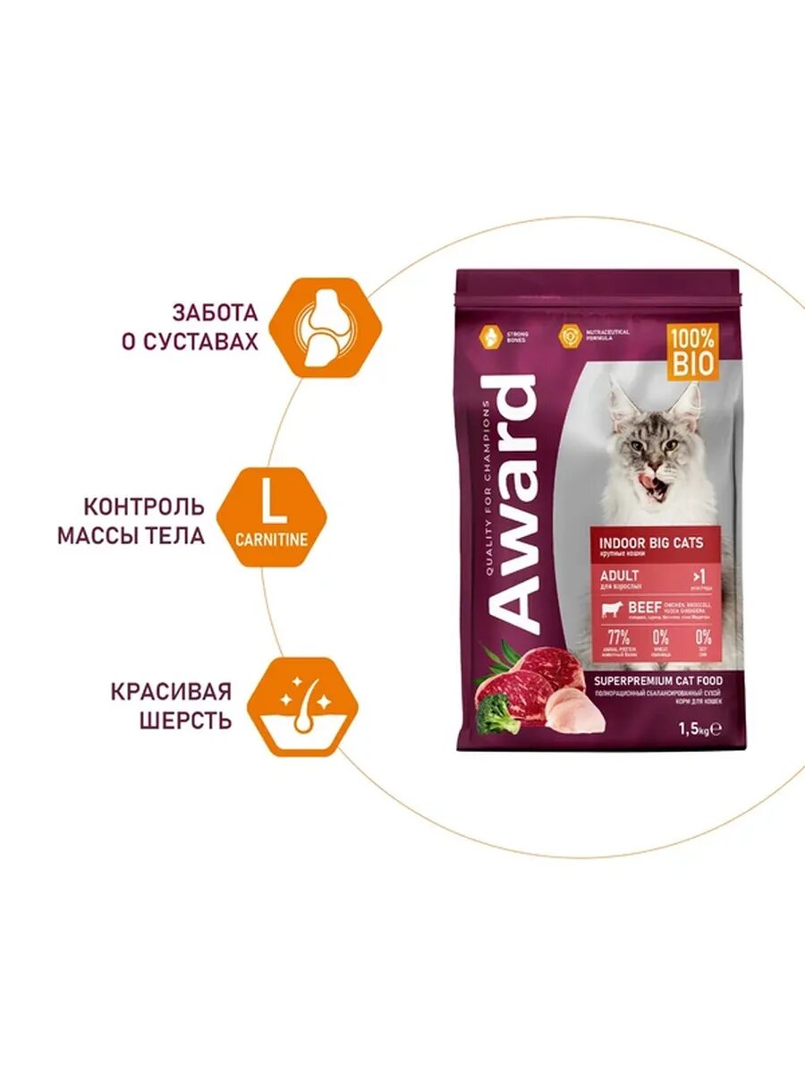Сухой корм AWARD Indoor Big cats для взрослых домашних кошек крупных пород с говядиной и курицей с добавлением брокколи и юкки Шидигера 1,5кг