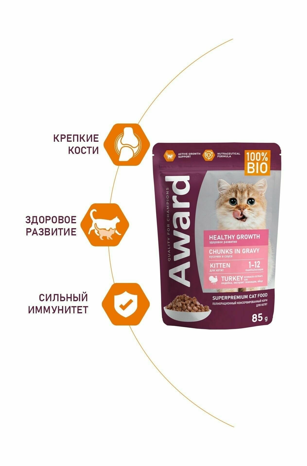Award Healthy growth - Влажный корм для котят от 1 месяца кусочки в соусе с индейкой 85г (Упаковка 24 шт)