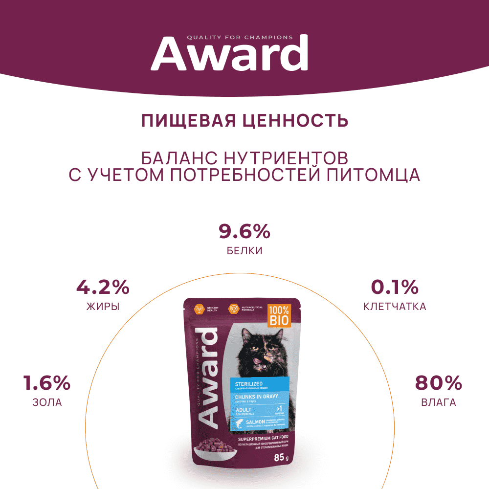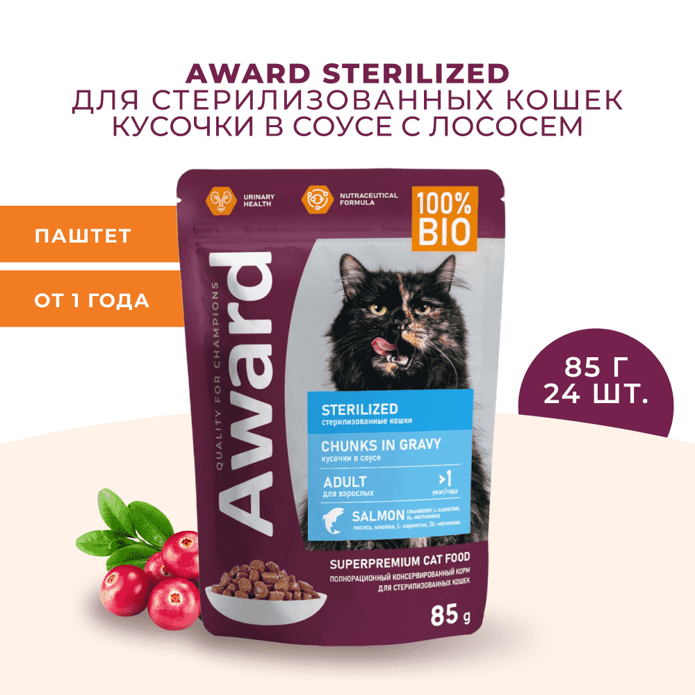 СохранитьAWARD Влажный корм Sterilized для взрослых стерилизованных кошек кусочки в соусе с лососем 85г*24шт. интересное: