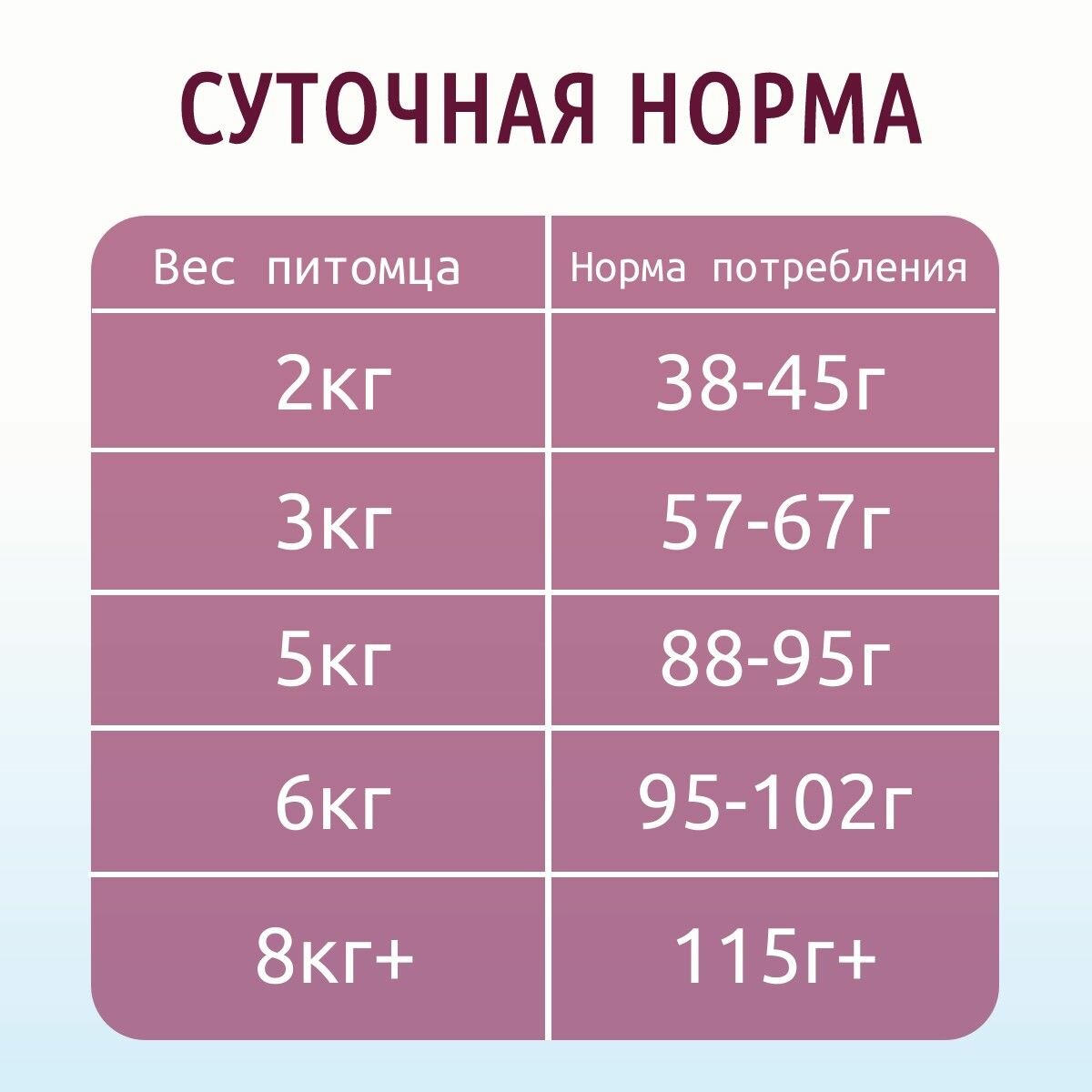 | Дозировка | Рекомендуемую ежедневную порцию корма (см. таблицу на упаковке или на сайте) можно разделить на два кормления. Индивидуальные потребности в питании могут отличаться в зависимости от размера, возраста и активности питомца. У кошки всегда должен быть доступ к свежей питьевой воде. Рекомендуется вводить корм в рацион питомца постепенно в течение недели. |