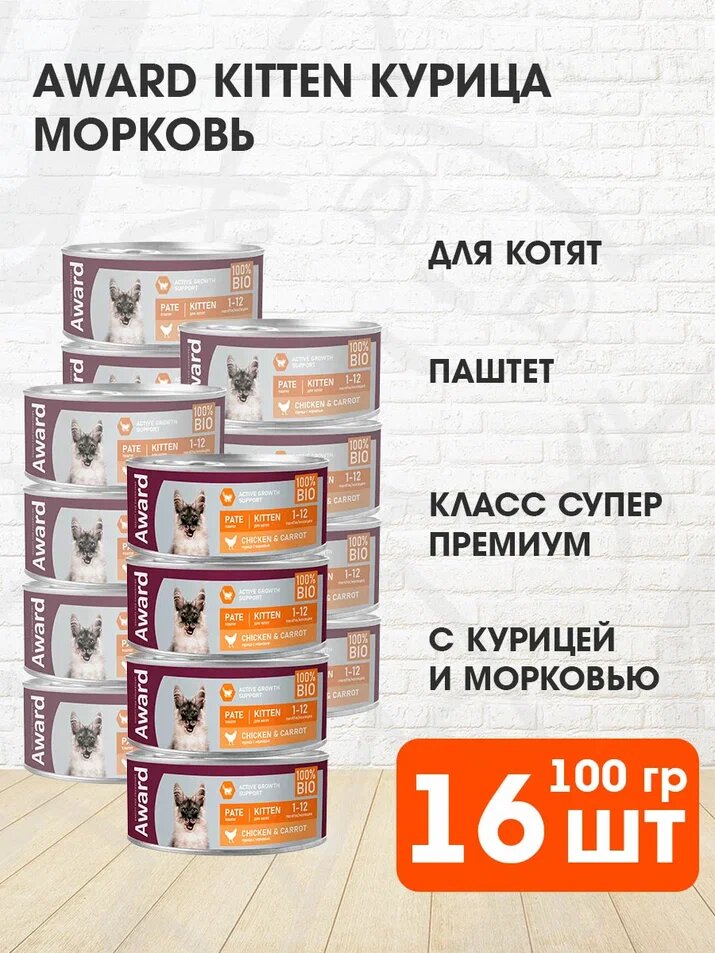 Влажный корм AWARD для котят Паштет из курицы с морковью 100г*16 шт.