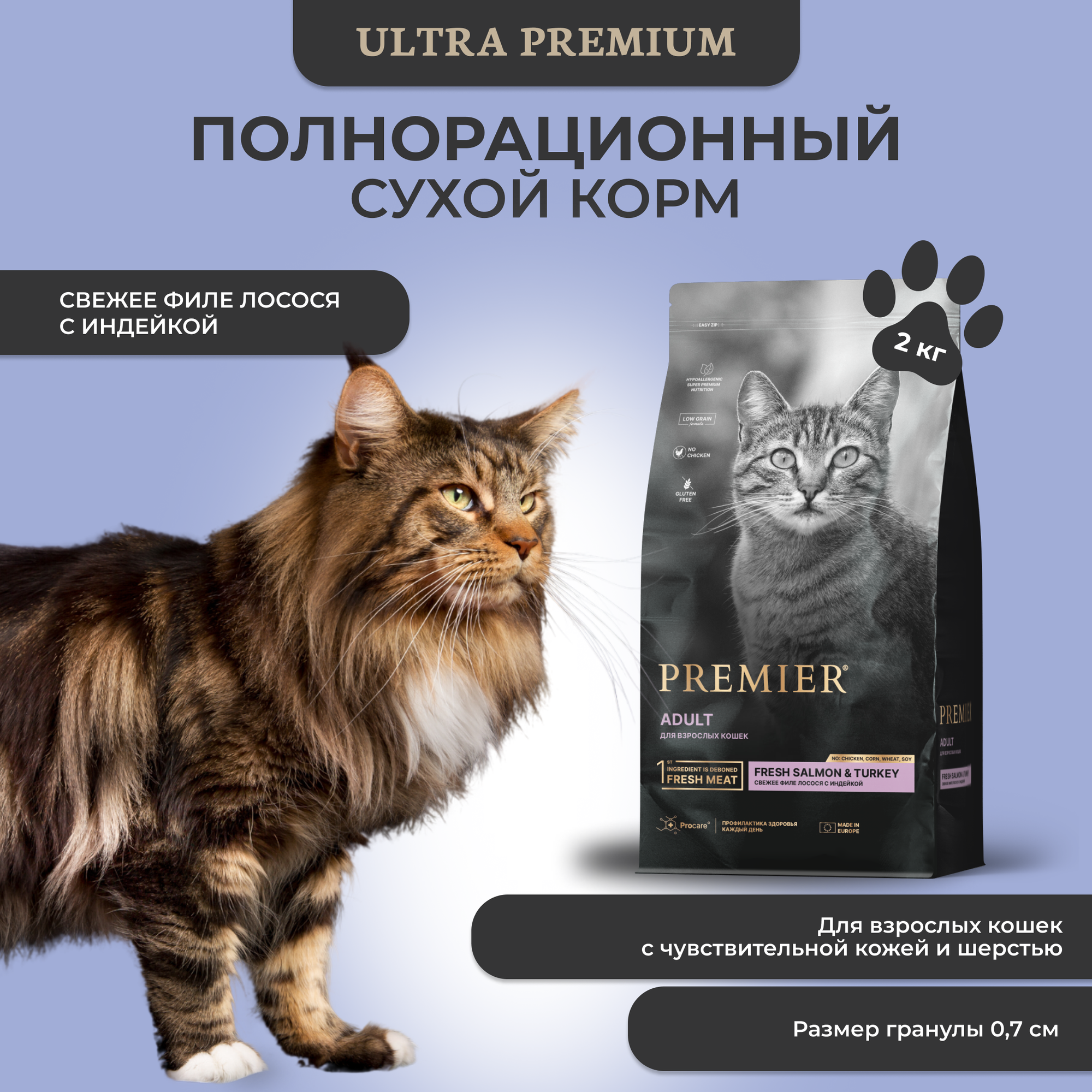 Premier Cat Salmon Turkey Adult сухой корм для взрослых кошек, свежее филе лосося с индейкой 2 кг
