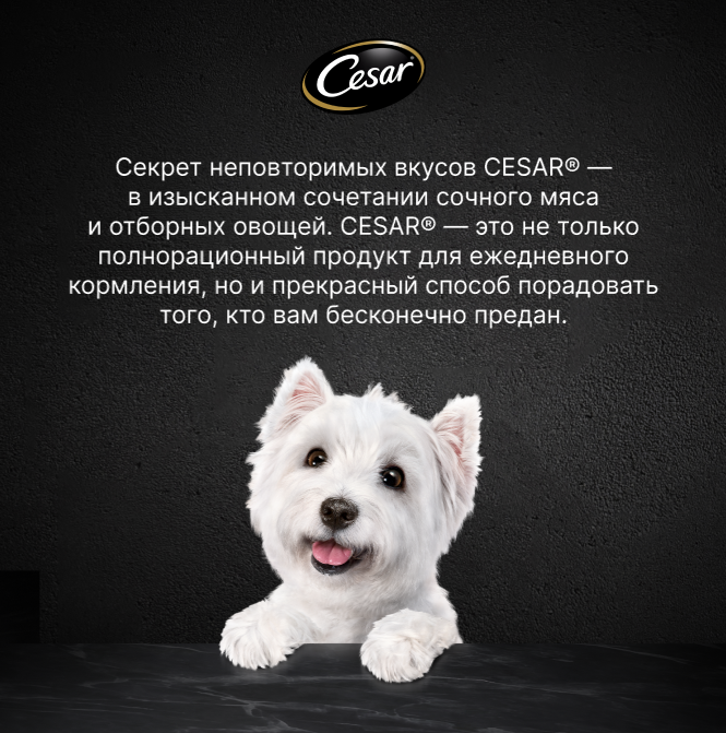 | Дополнительная информация | рекомендуемое количество корма CESAR® (вес животного, кг – упаковок корма в сутки, шт): 3 кг – 4; 4 кг – 5; 6 кг – 6-7. Вашего питомца следует кормить кормом комнатной температуры. Не забывайте о свежей воде, которая должна быть в миске вашего питомца постоянно. |