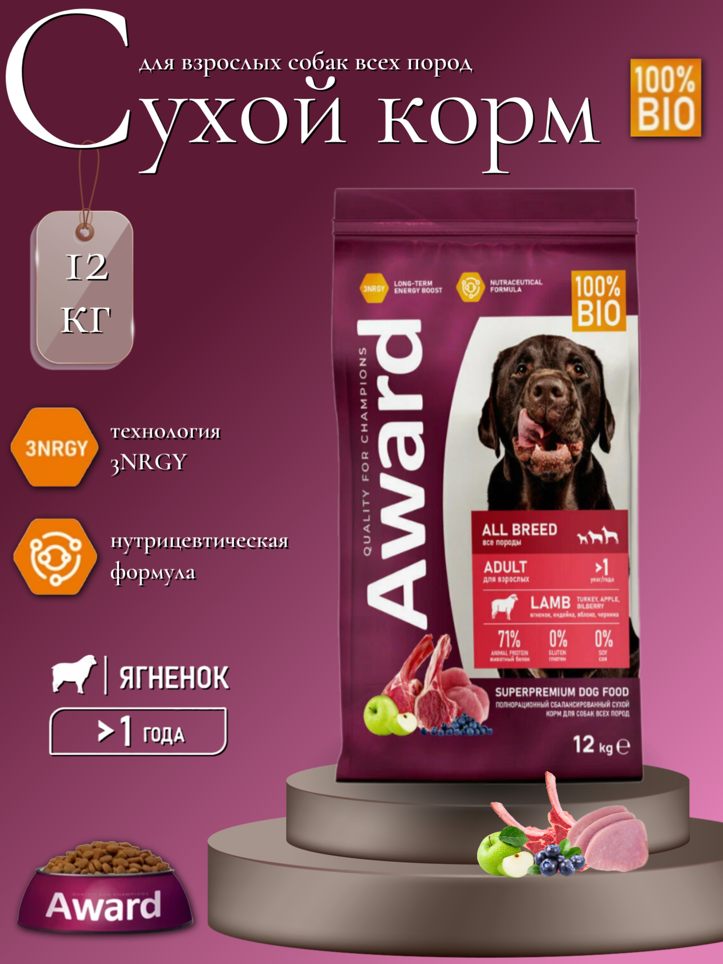 Купить AWARD Сухой корм для взрослых собак всех пород с ягненком и индейкой с добавлением яблока и черники 12кг