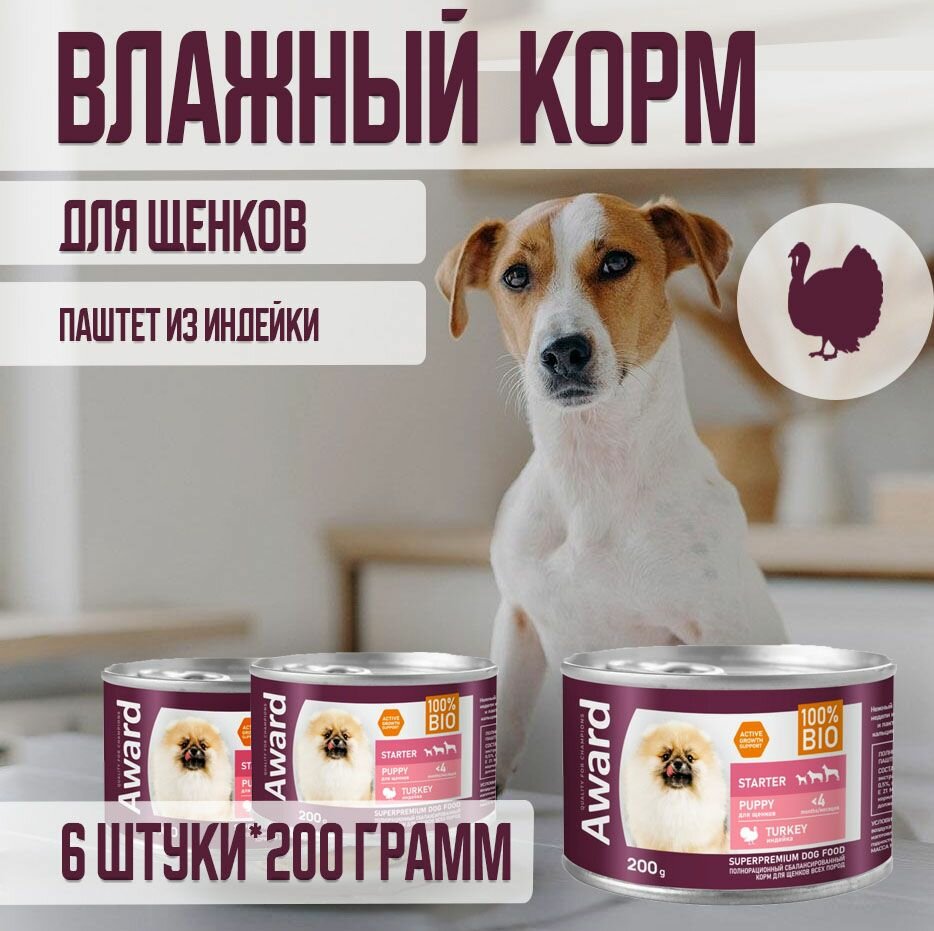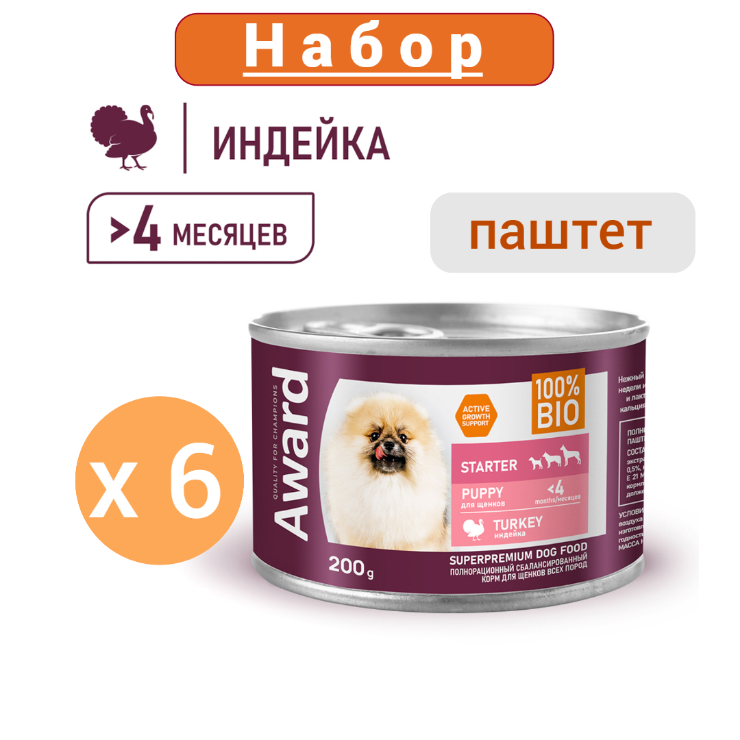 Купить Влажный корм AWARD для щенков с начала прикорма до 4 месяцев, беременных и кормящих сук паштет из индейки 200 г 6 шт.