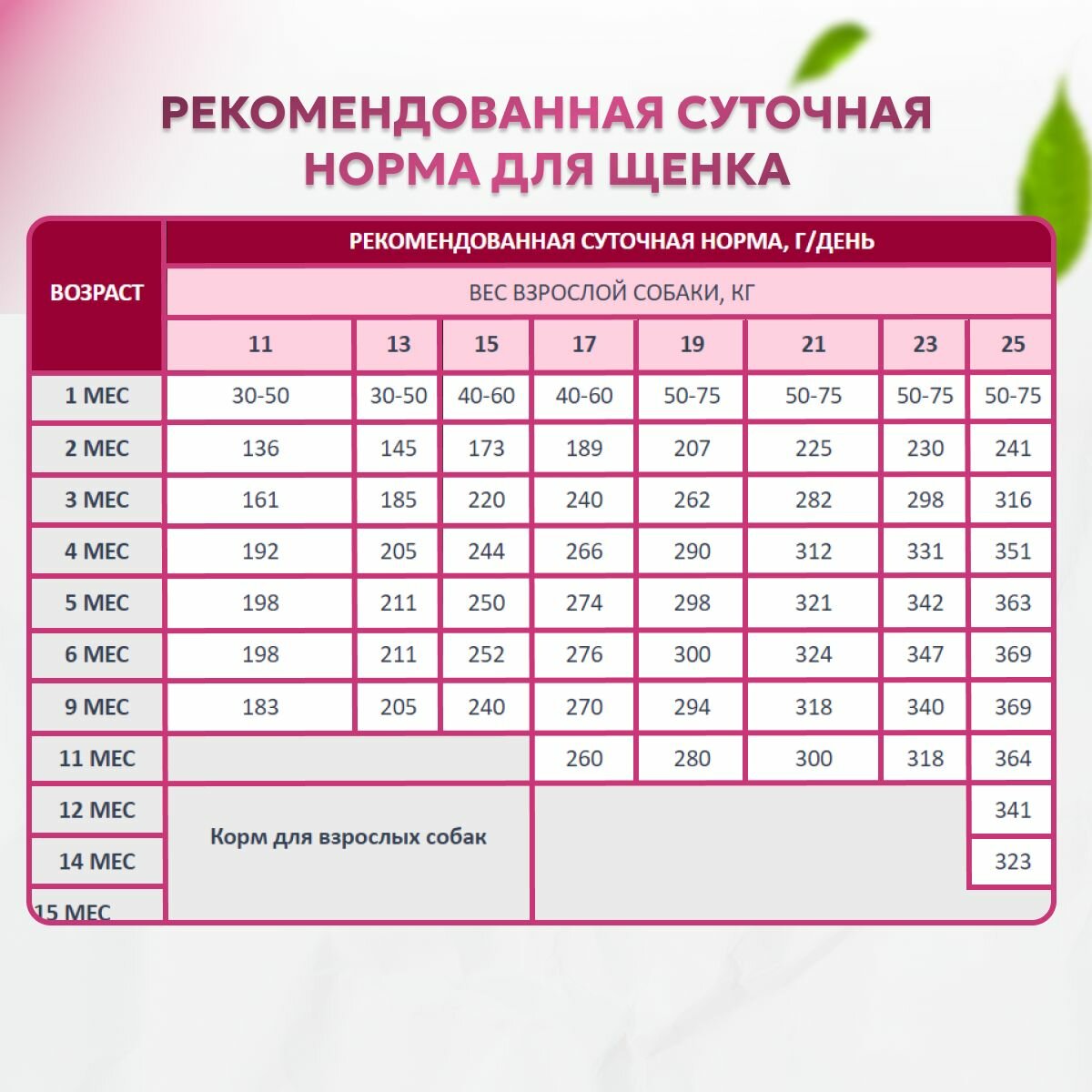 | Дозировка | Рекомендуемую ежедневную порцию корма (см. таблицу на упаковке или на сайте) можно разделить на два кормления. Индивидуальные потребности в питании могут отличаться в зависимости от размера, возраста и активности питомца. У собаки всегда должен быть доступ к свежей питьевой воде. Рекомендуется вводить корм в рацион питомца постепенно в течение недели. |
