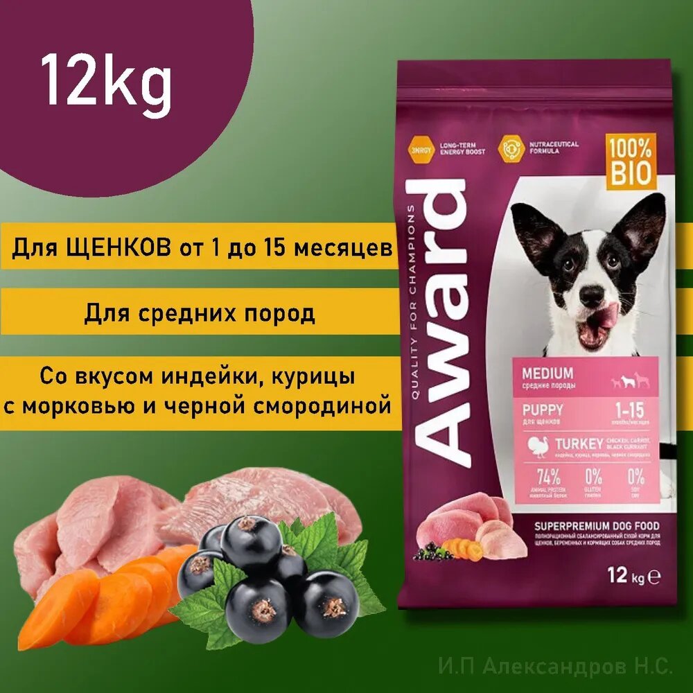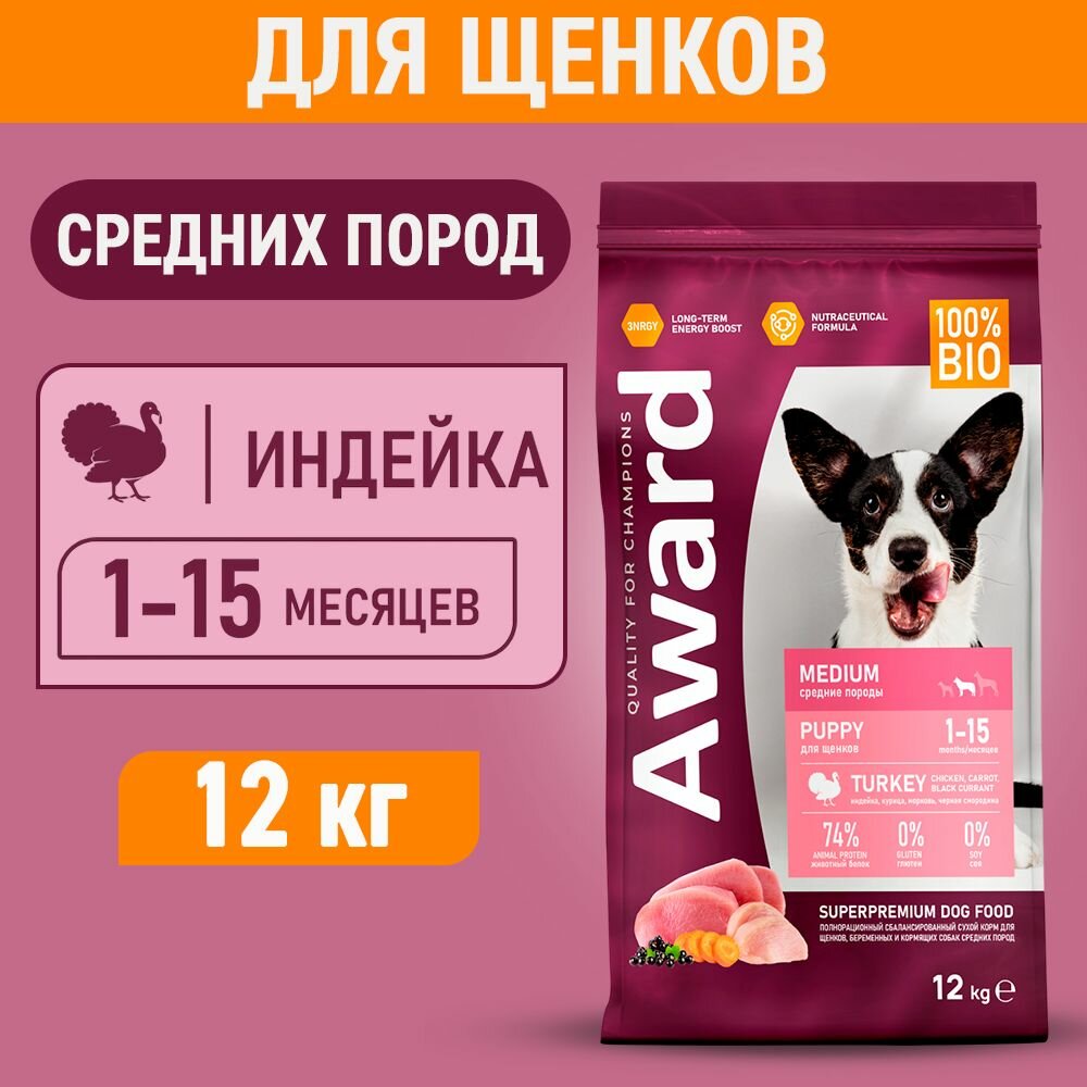 Купить AWARD сухой корм для щенков средних пород от 1 месяца, беременных и кормящих сук, с индейкой, курицей, морковью и черной смородиной - 12 кг