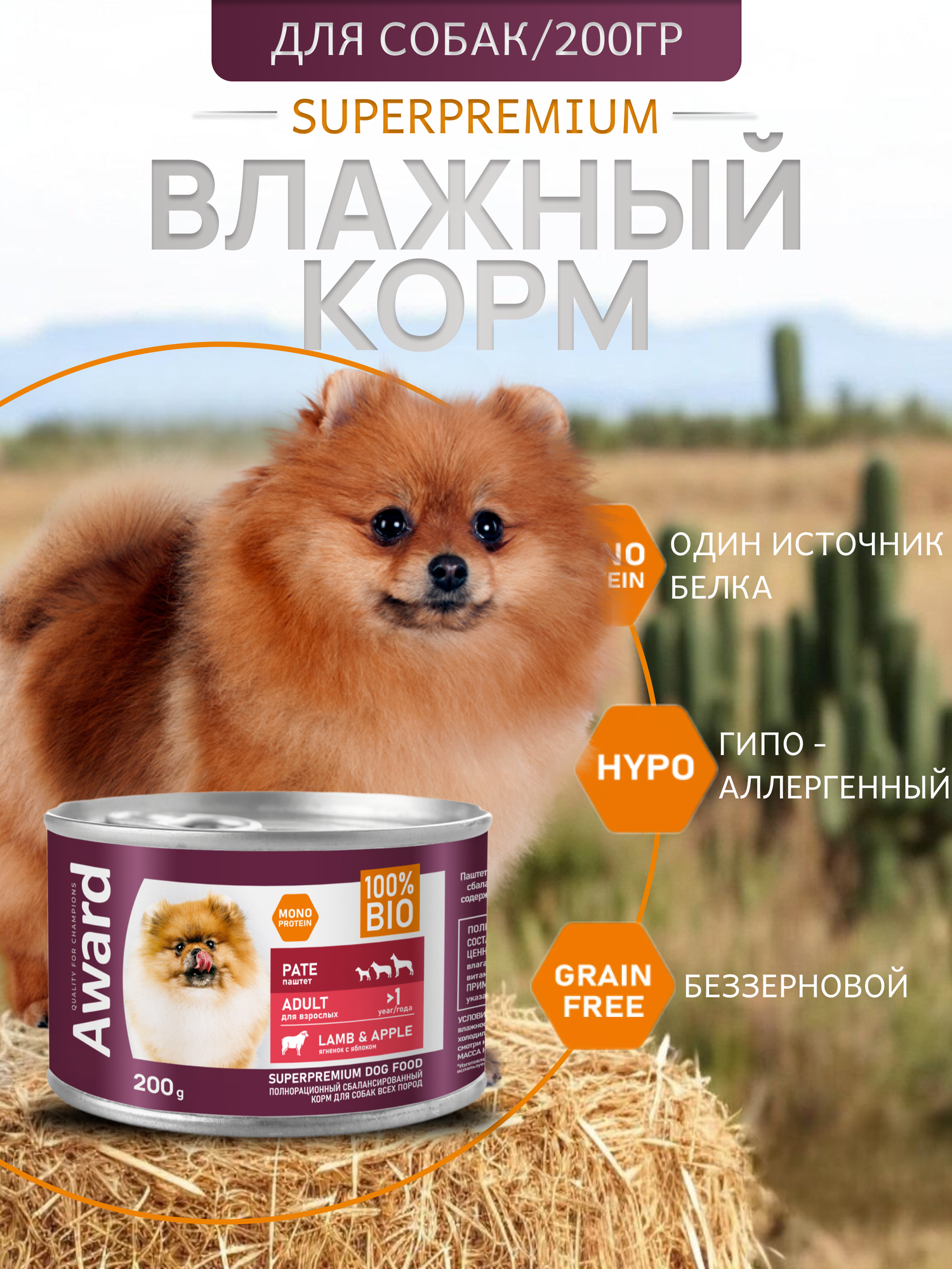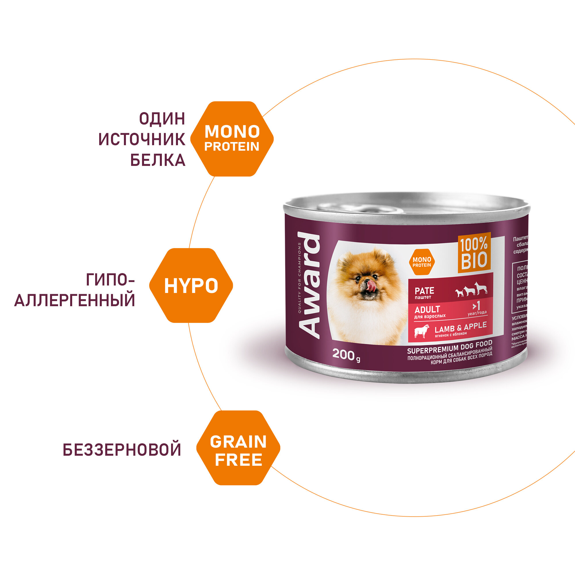 Влажный корм для собак AWARD, паштет из ягненка с яблоком, 12 шт. х 200 г
