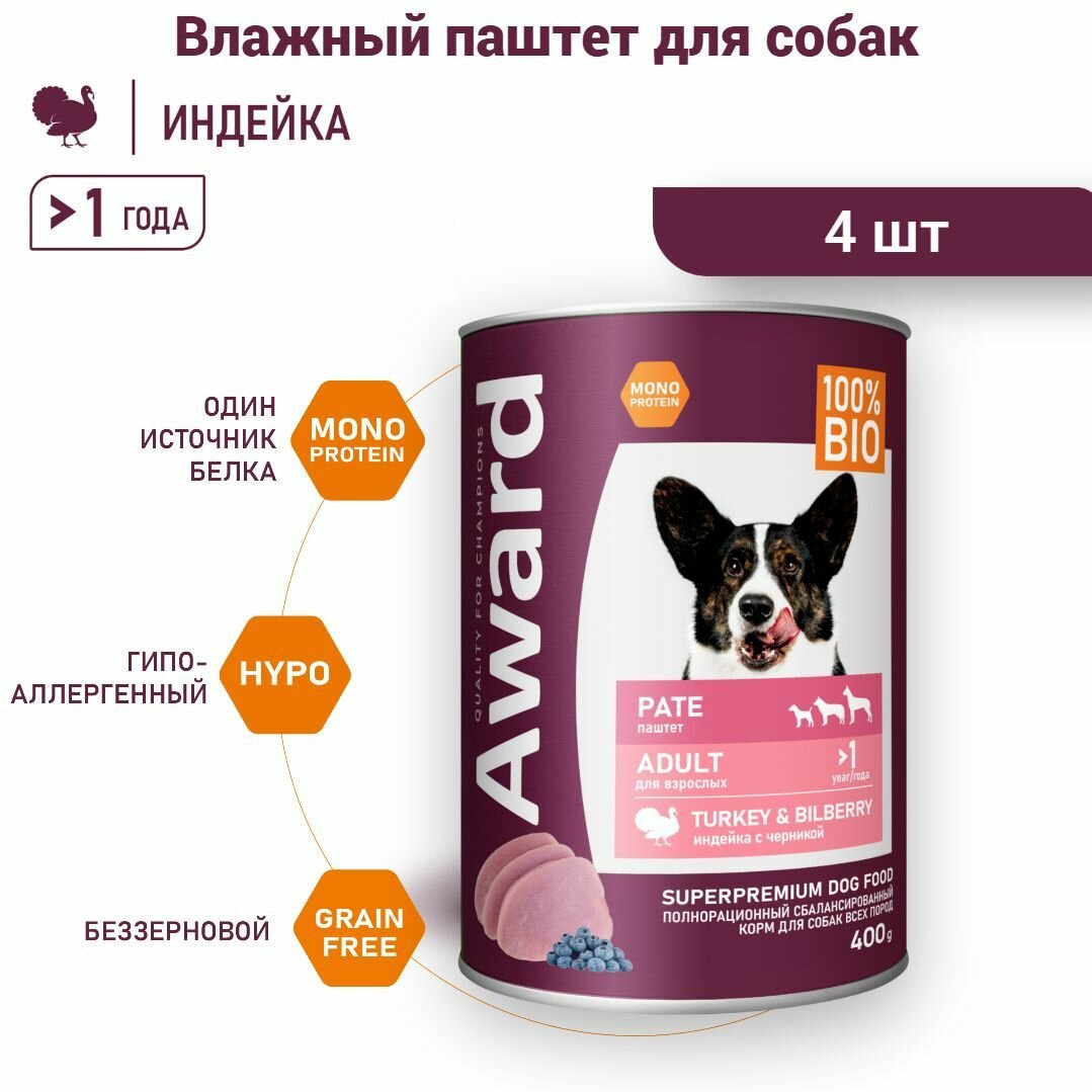 Влажный корм для собак AWARD, паштет из индейки с черникой, 4 шт. х 400 г