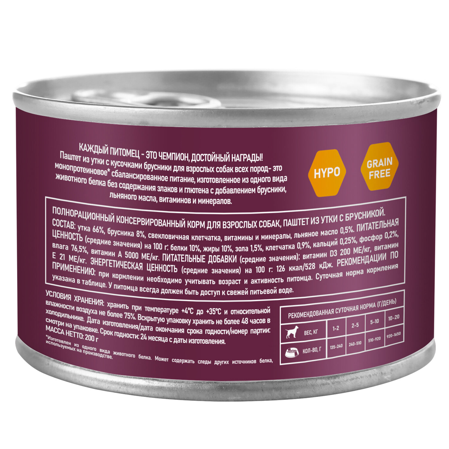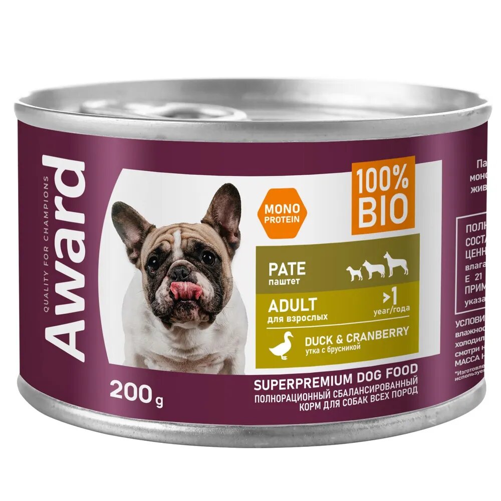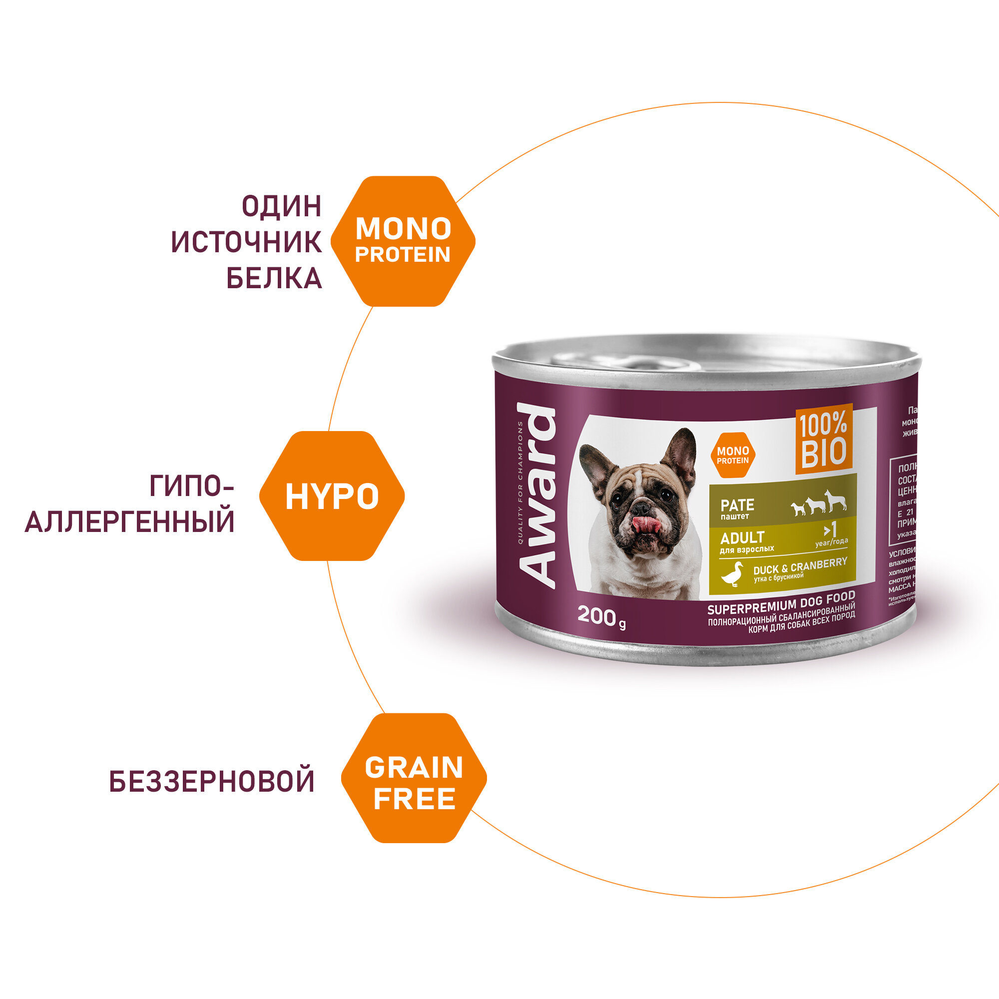 AWARD влажный корм для взрослых собак, паштет с уткой и брусникой, в консервах - 200 г х 12 шт