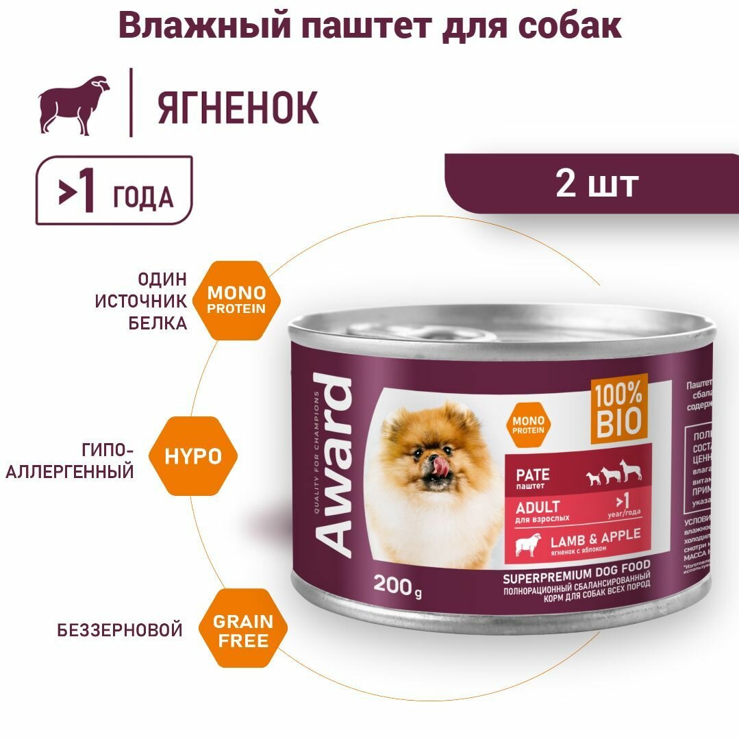 Купить Влажный корм для собак AWARD, паштет из ягненка с яблоком, 2 шт. х 200 г