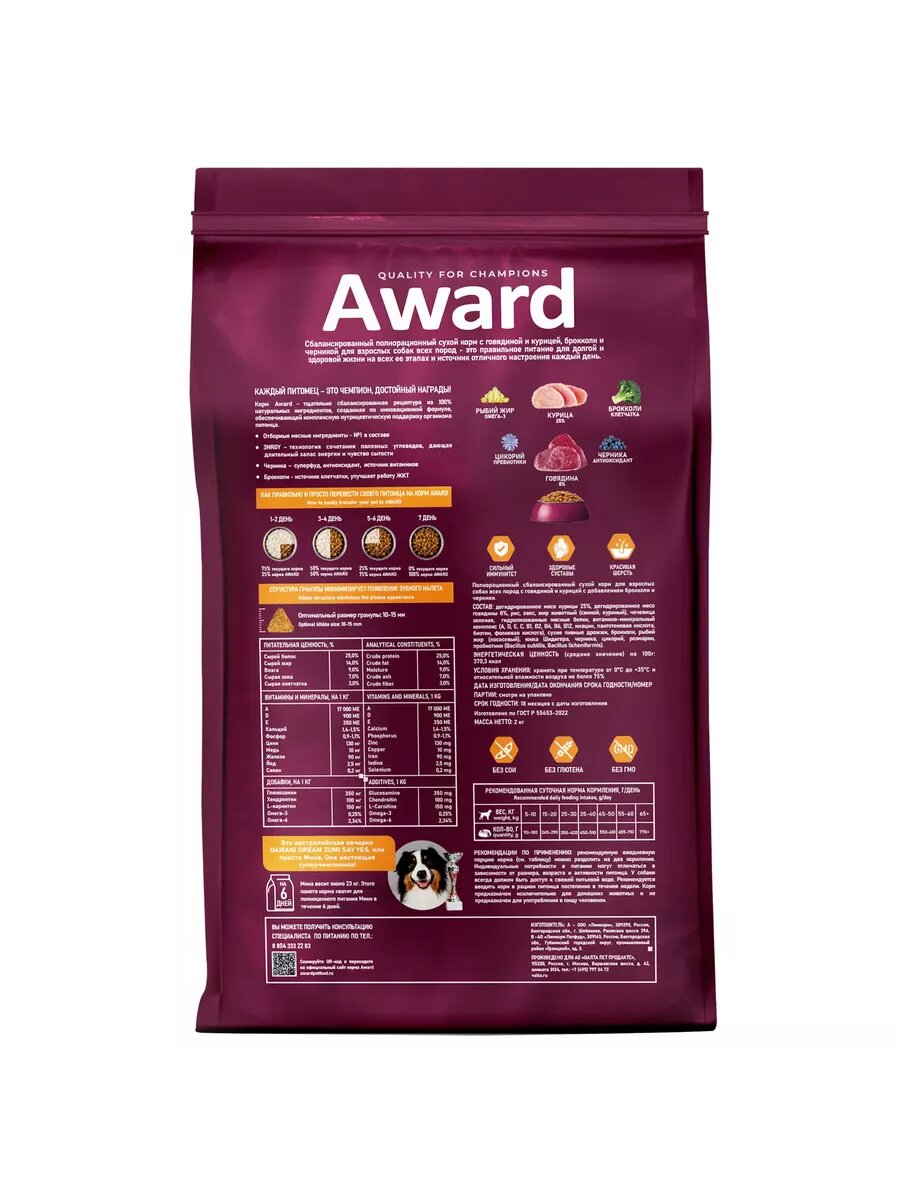 Сухой корм AWARD Авард для взрослых собак всех пород с говядиной и курицей с добавлением брокколи и черники, 2кг