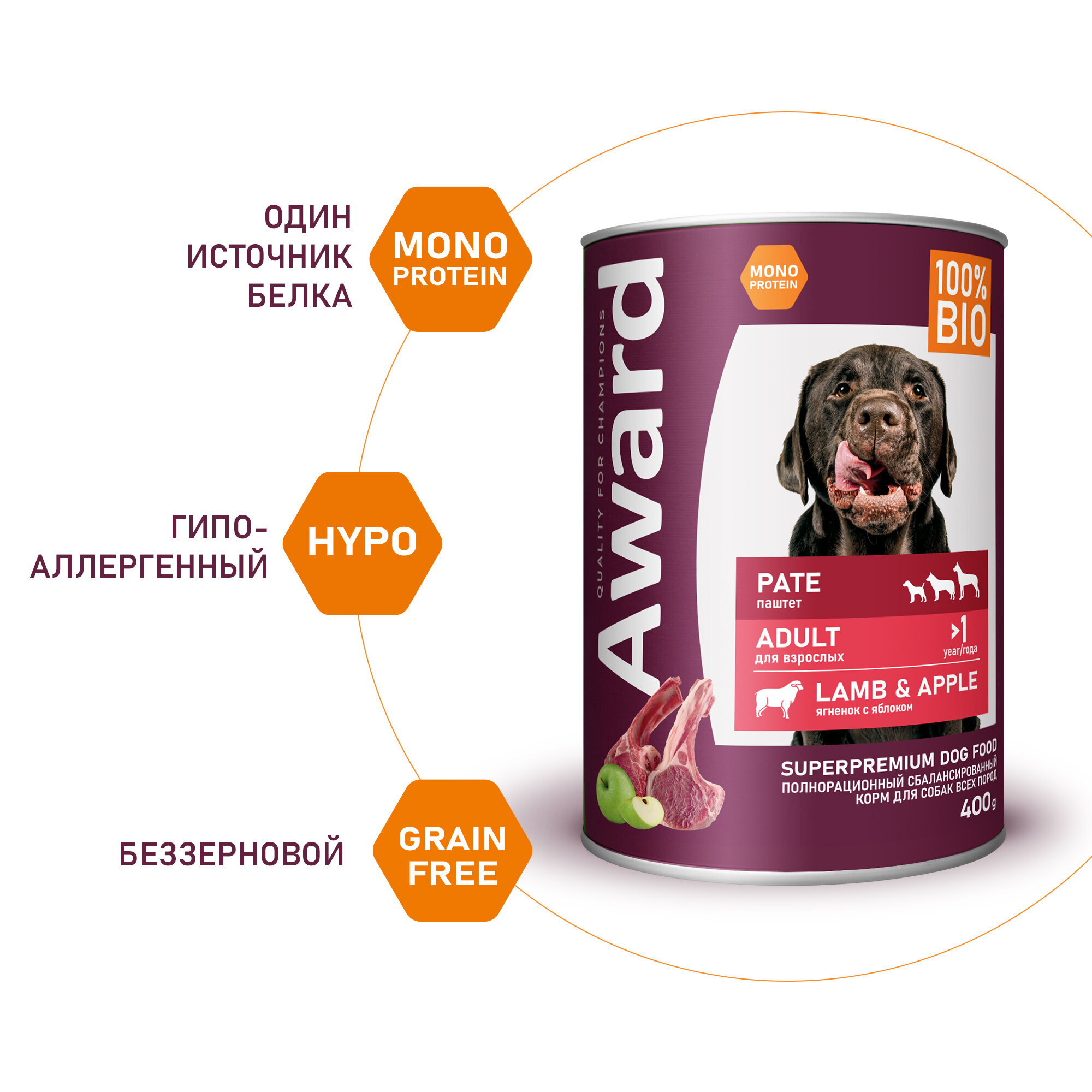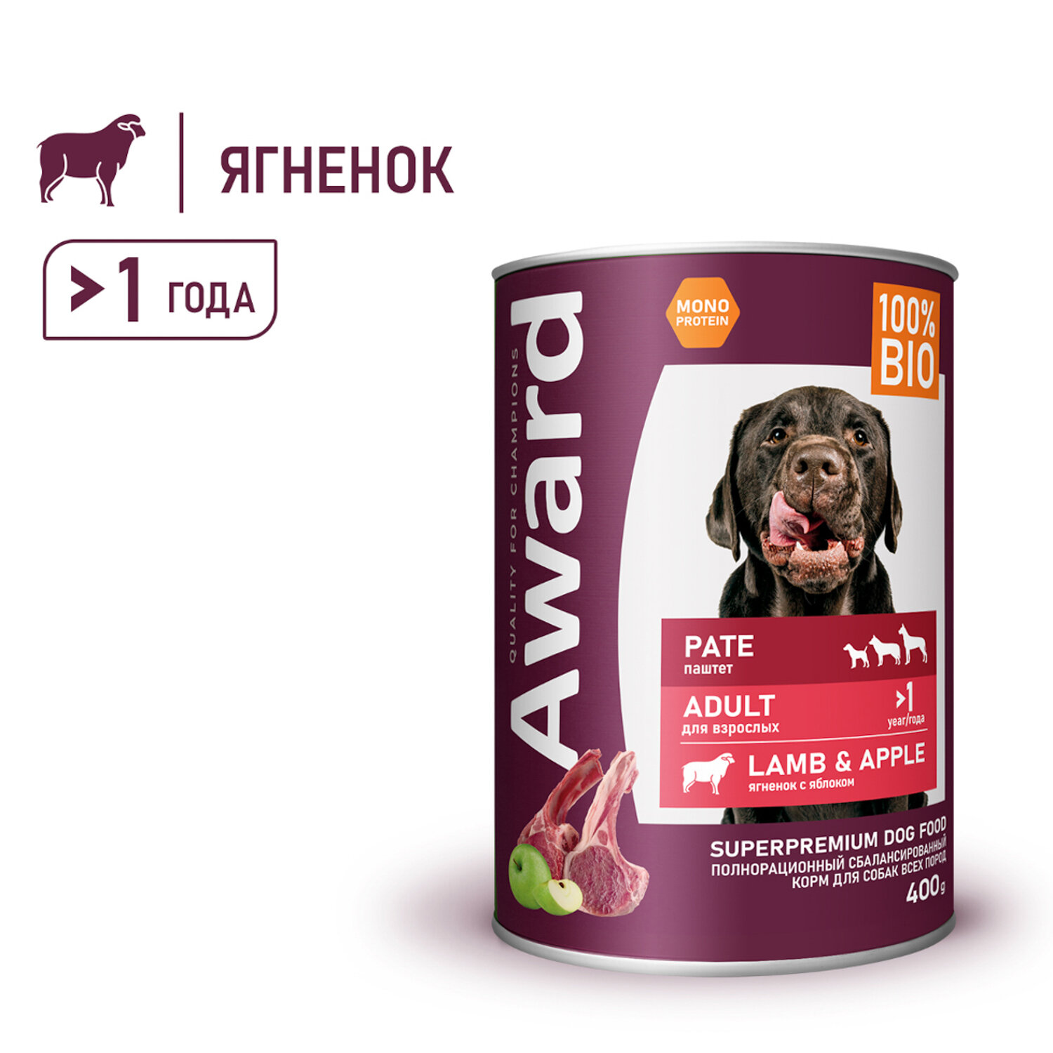 Влажный корм для собак AWARD, паштет из ягненка с яблоком, 400 г