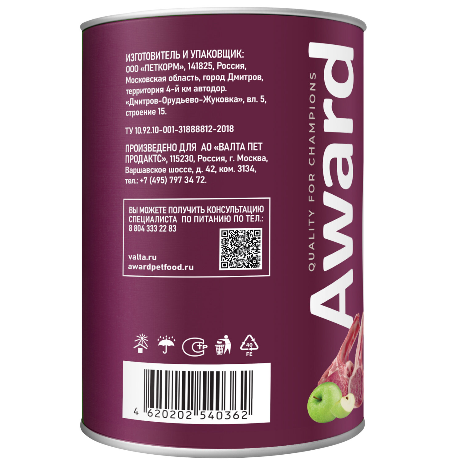 Ниже Вы можете прочитать отзывы на Влажный корм AWARD для взрослых собак паштет из ягненка с яблоком 400г, ознакомится с подробными характеристиками, посмотреть интересные обзоры и фотографии на Влажный корм AWARD для взрослых собак паштет из ягненка с яблоком 400г.