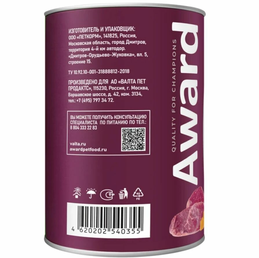 Влажный корм AWARD для собак паштет из говядины с бататом 400г * 12 шт