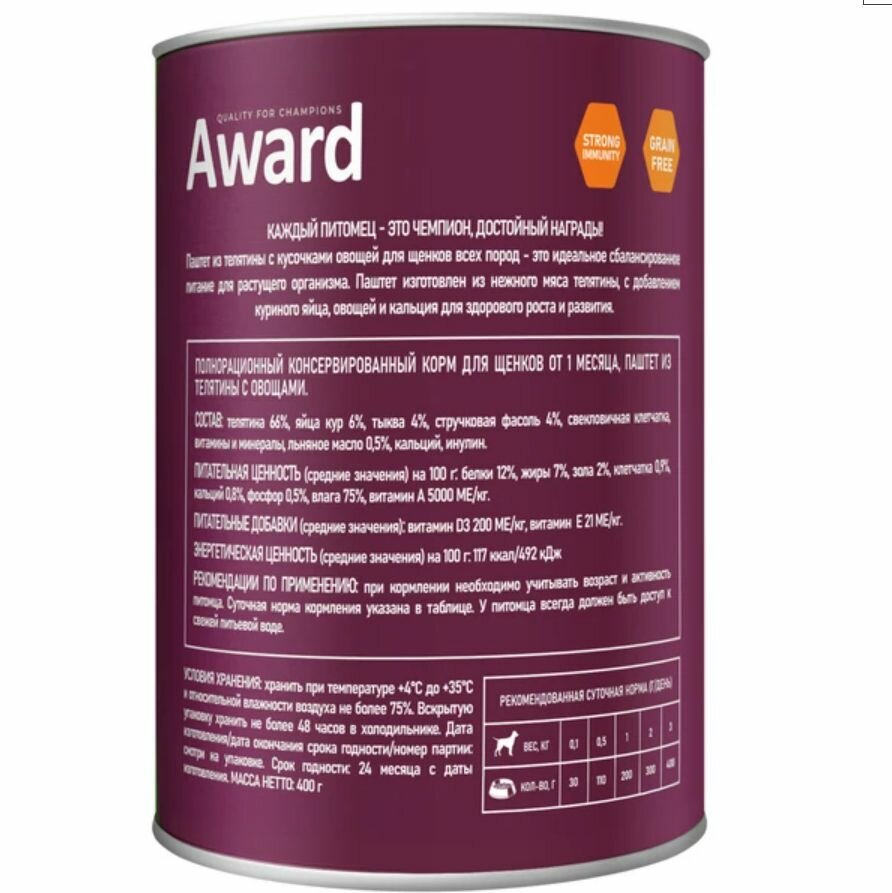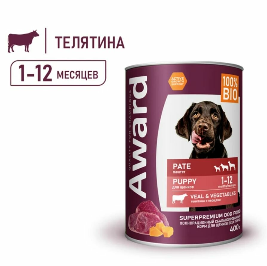 Влажный корм AWARD для щенков от 1 месяца паштет из телятины с овощами 400г * 12 шт