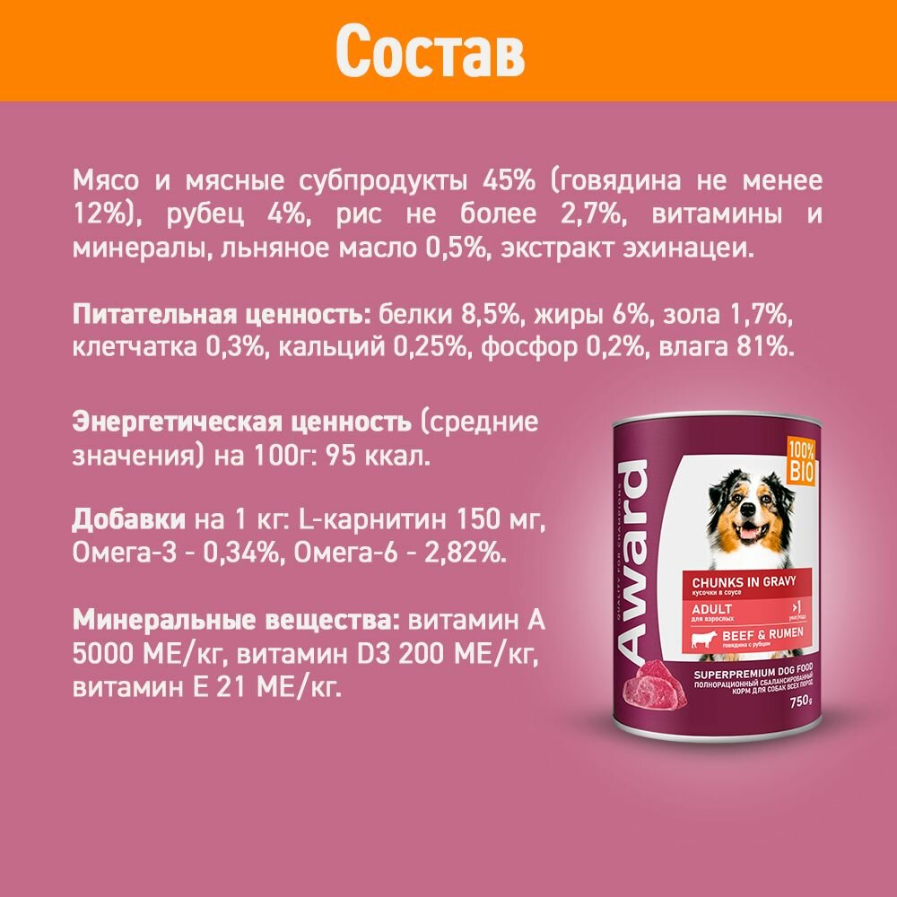 Купить AWARD BEEF & RUMEN для взрослых собак всех пород с говядиной и рубцом в соусе банка 750 гр х 12 шт