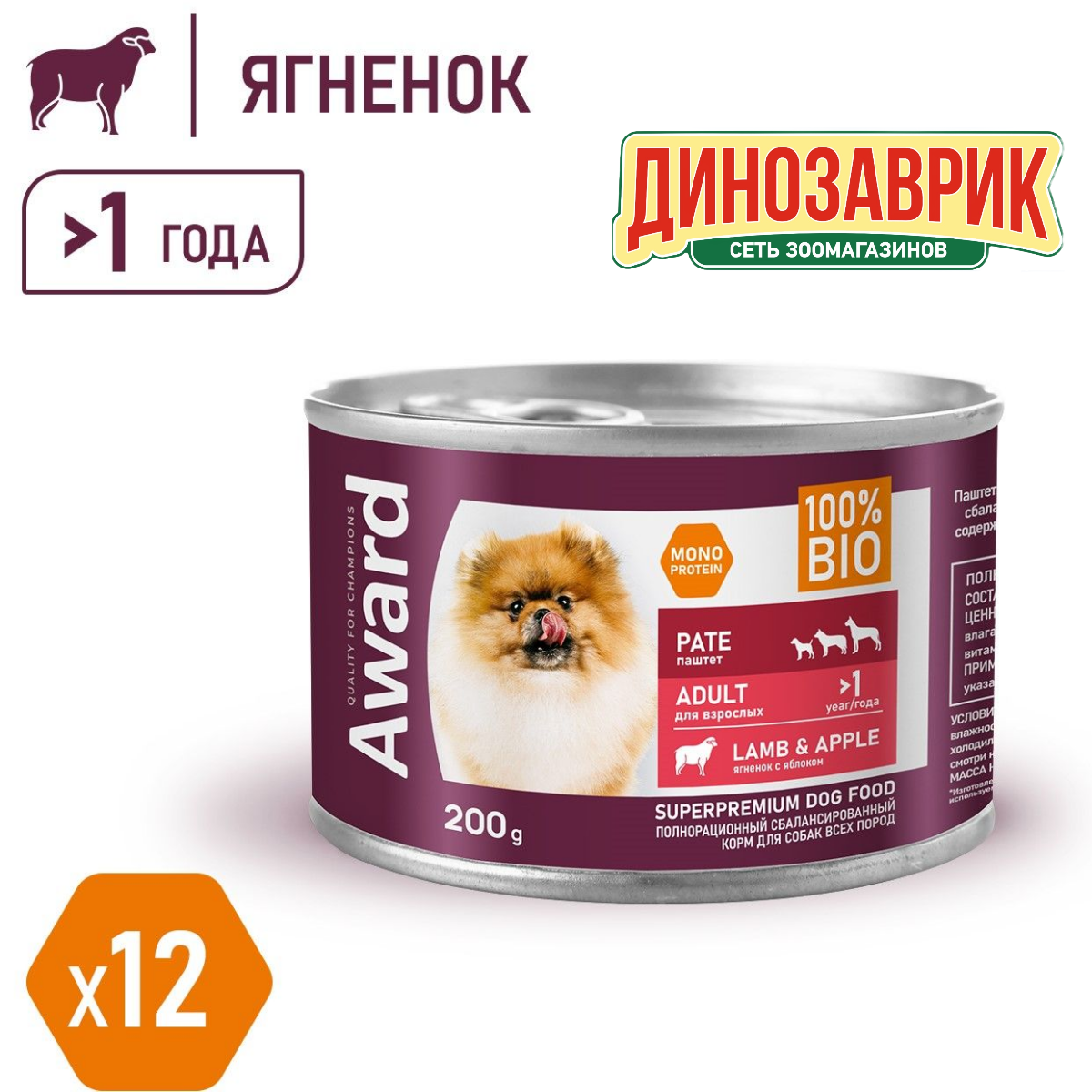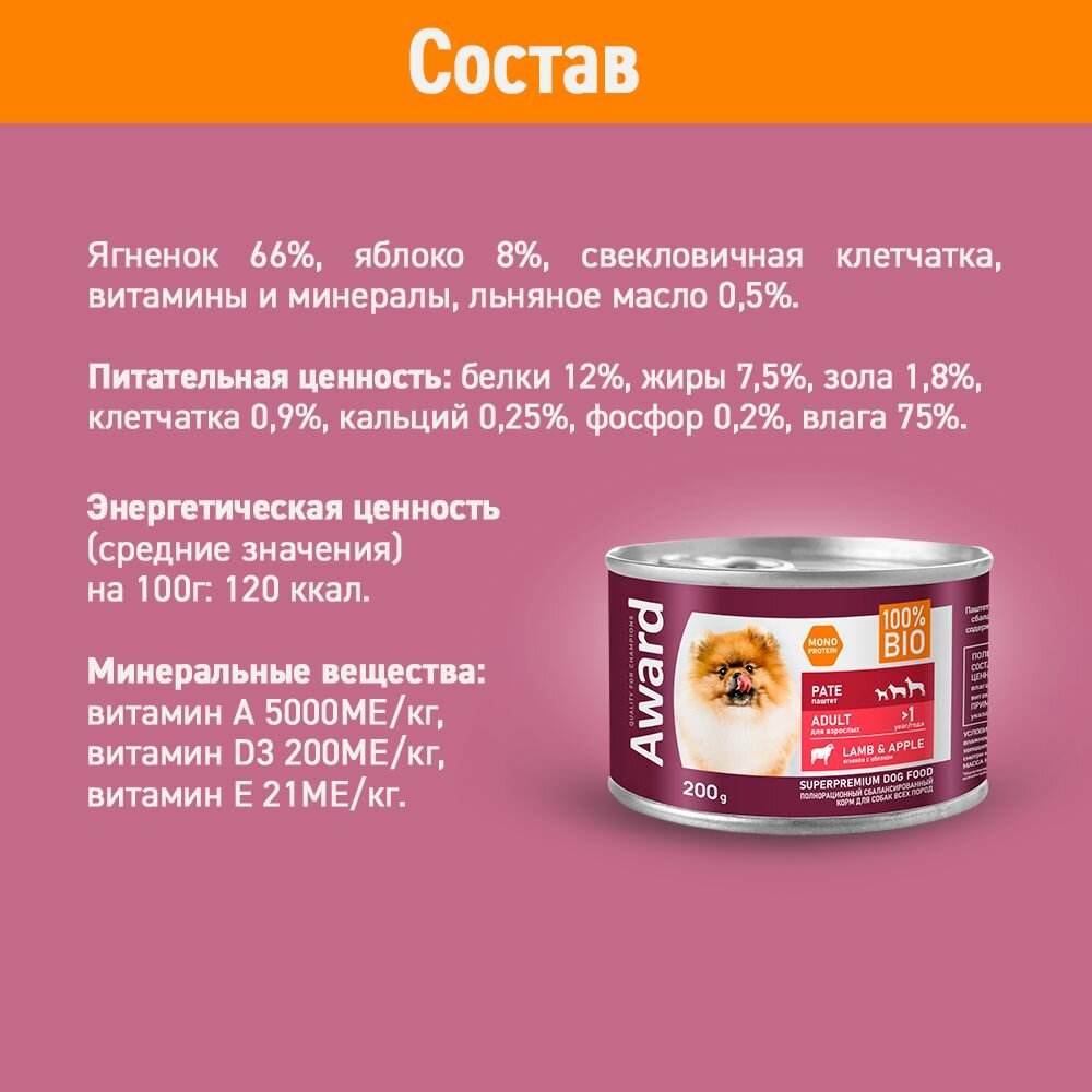 Влажный корм для собак AWARD, паштет из ягненка с яблоком, 12 шт. х 200 г