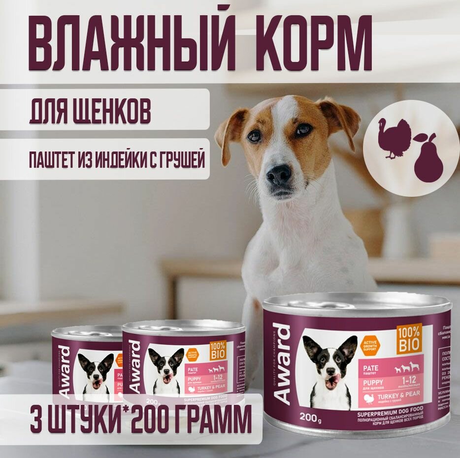 Влажный корм AWARD для щенков с начала прикорма до 4 месяцев, беременных и кормящих сук паштет из индейки 200г х 3шт