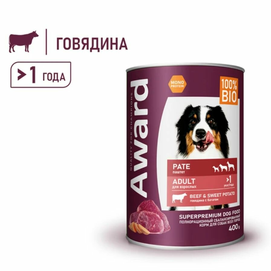 Влажный корм AWARD для собак паштет из говядины с бататом 400г * 12 шт