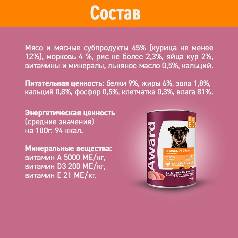 Влажный корм AWARD для щенков кусочки с курицей и морковью 750г * 12 шт