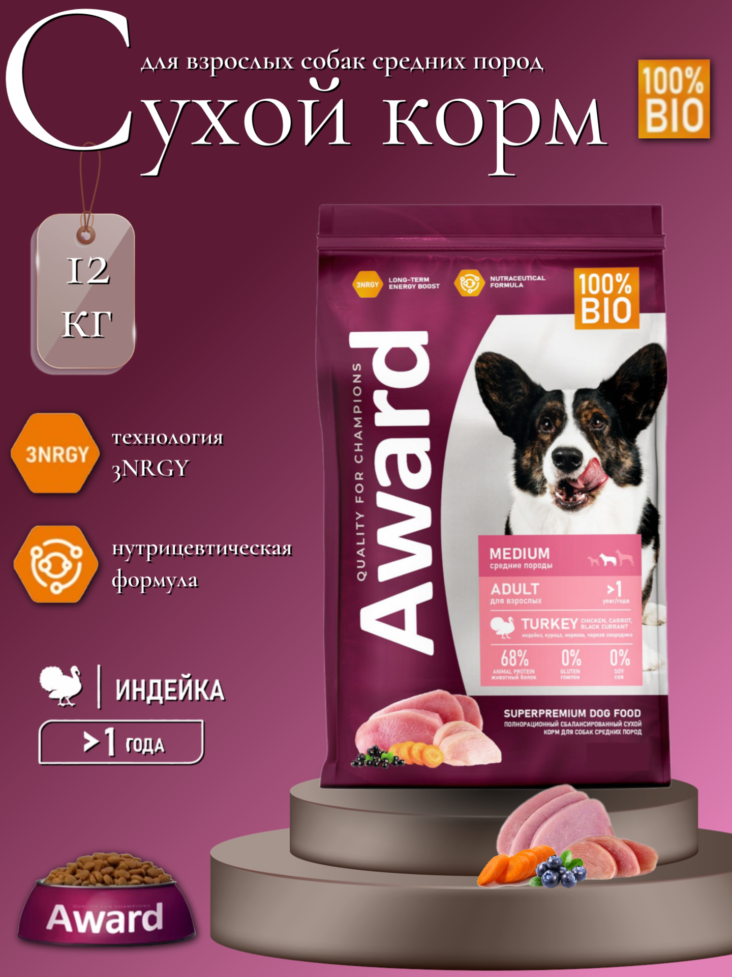 Купить AWARD Сухой корм д/взр. собак средних пород с индейкой и курицей, морковью и черной смородиной, 12кг
