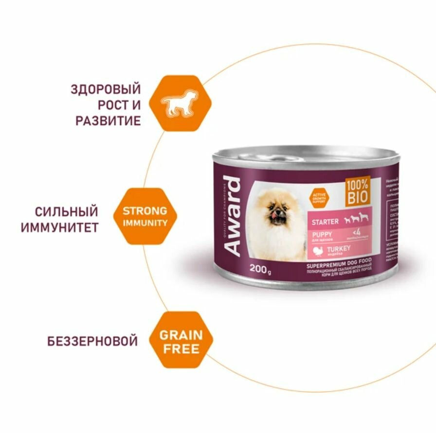Влажный корм Award для щенков от 1 месяца, паштет из индейки с грушей, консервы, 6 шт х 200 гр