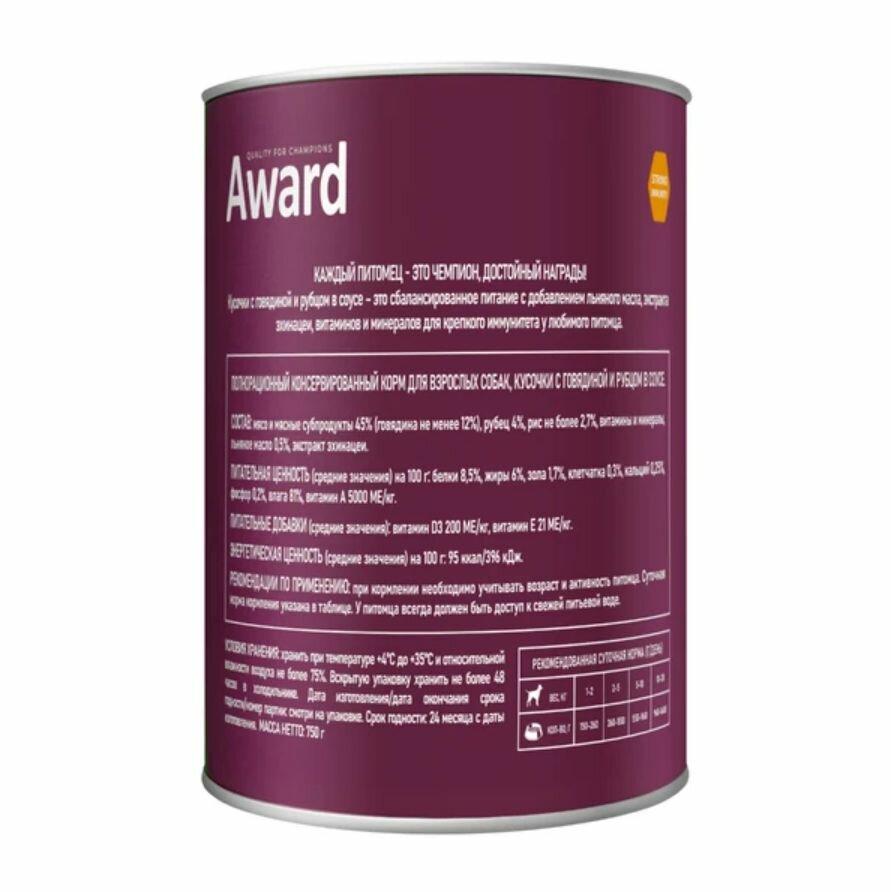 AWARD BEEF & RUMEN для взрослых собак всех пород с говядиной и рубцом в соусе банка 750 гр х 12 шт