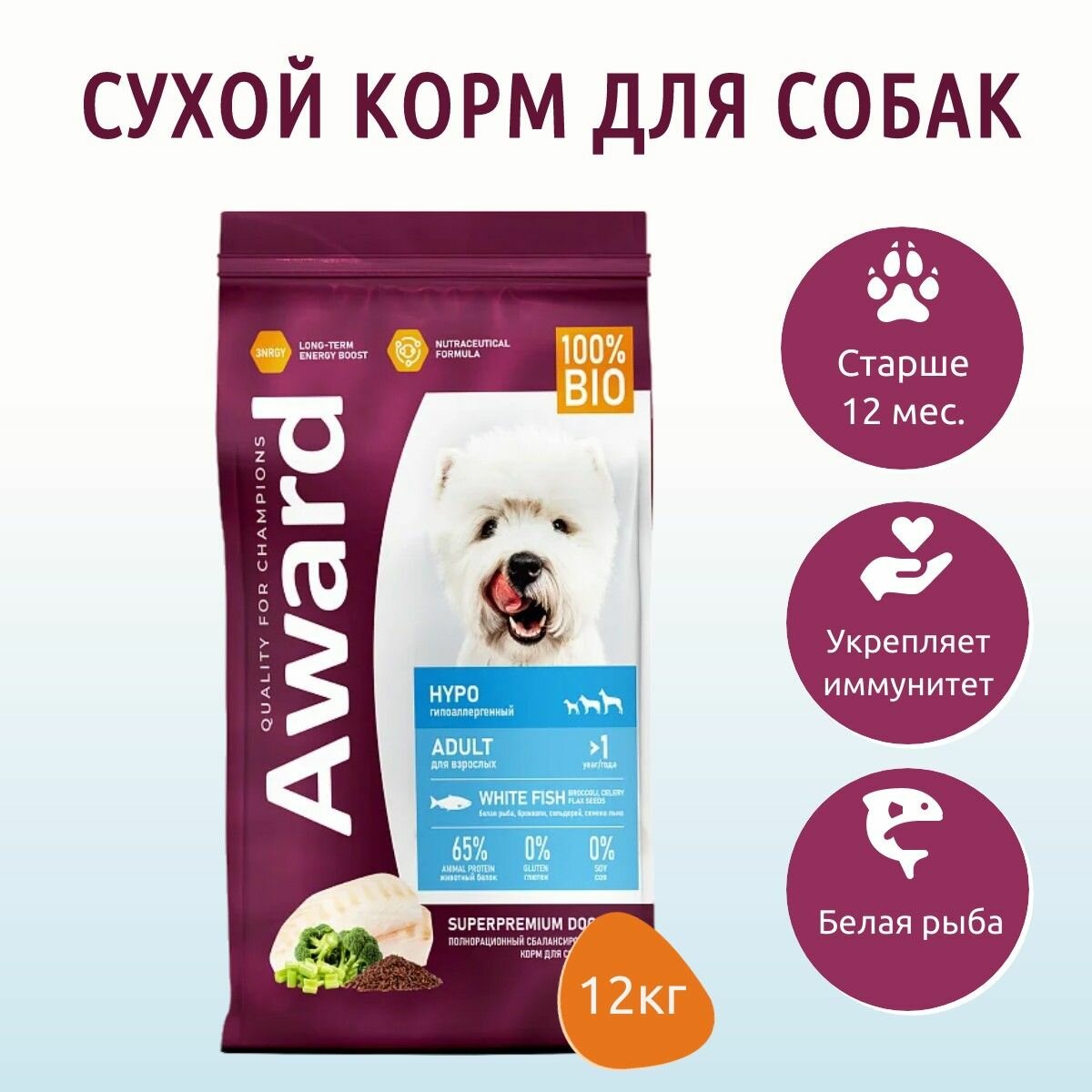Купить Сухой корм AWARD HYPO 12 кг для взрослых собак всех пород с белой рыбой с добавлением брокколи, сельдерея и семян льна
