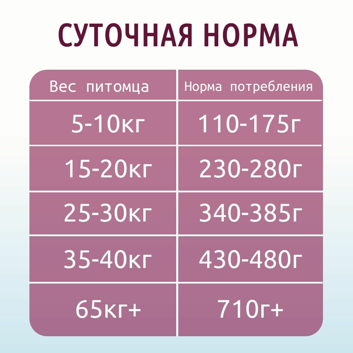 | Дозировка | Рекомендуемую ежедневную порцию корма (см. таблицу на упаковке или на сайте) можно разделить на два кормления. Индивидуальные потребности в питании могут отличаться в зависимости от размера, возраста и активности питомца. У собаки всегда должен быть доступ к свежей питьевой воде. Рекомендуется вводить корм в рацион питомца постепенно в течение недели. |