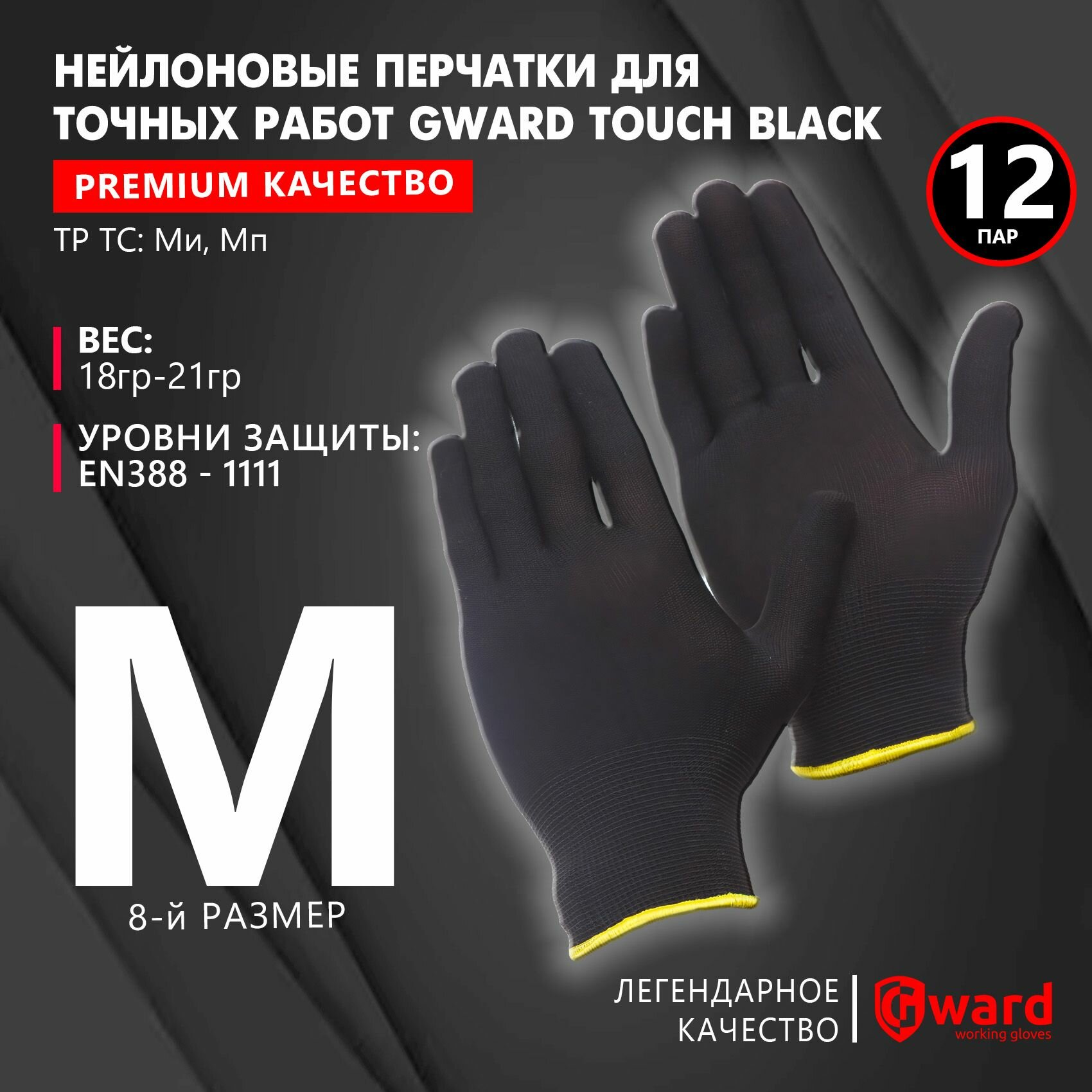 Перчатки нейлоновые, размер S Gward Touch Black черные, 12 пар.