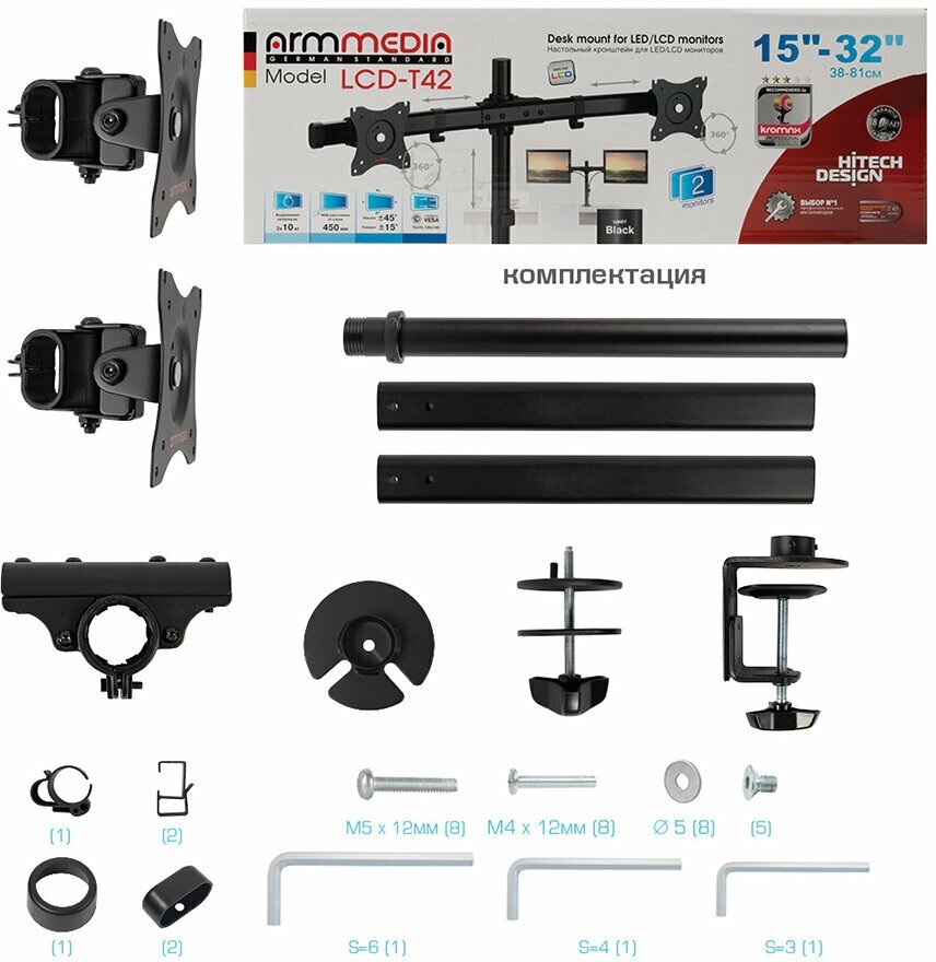 СохранитьКронштейн для мониторов Arm Media LCD-T42 Черный, 15"-32" настольный поворот и наклон max 20 кг интересное: