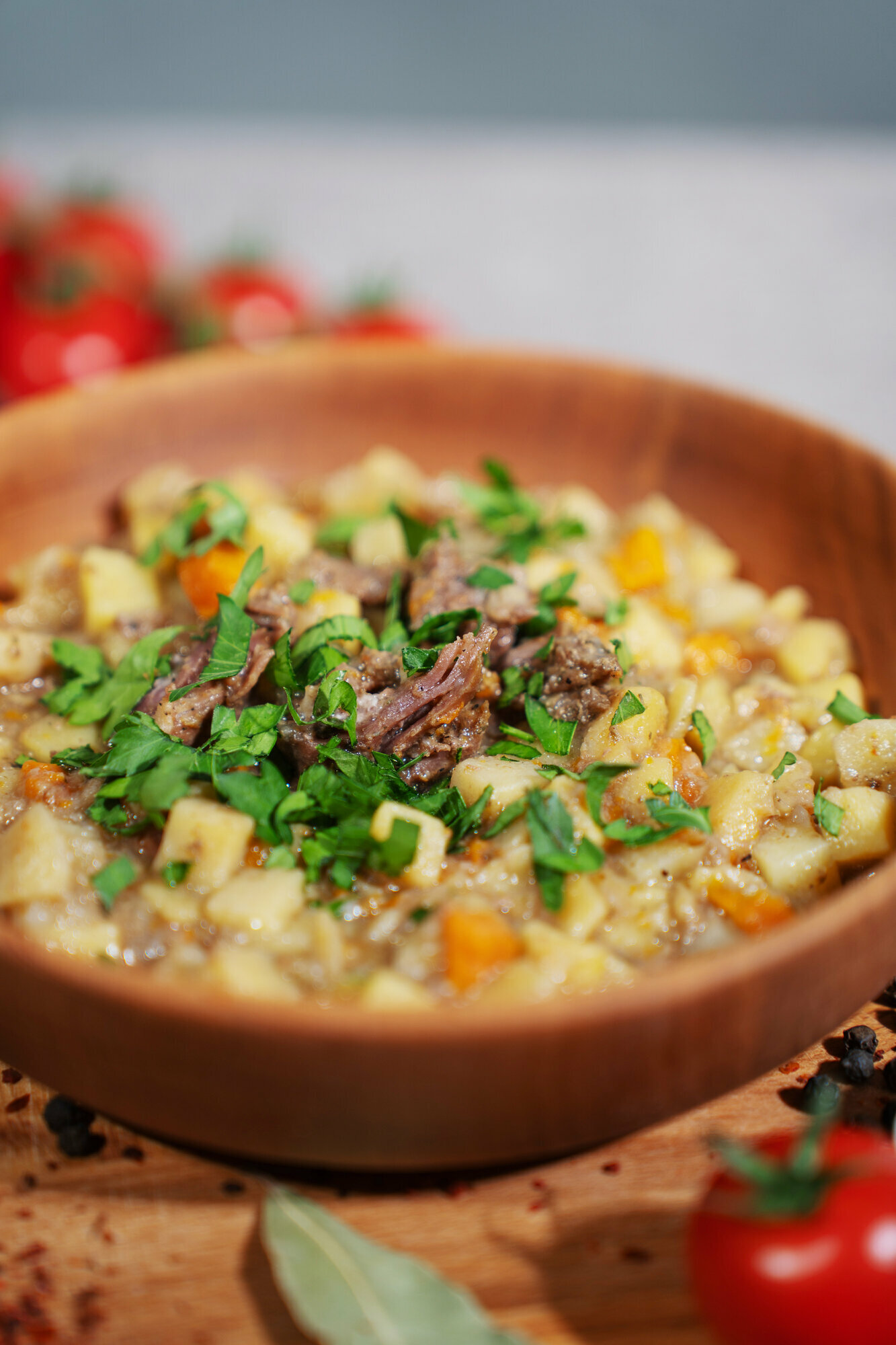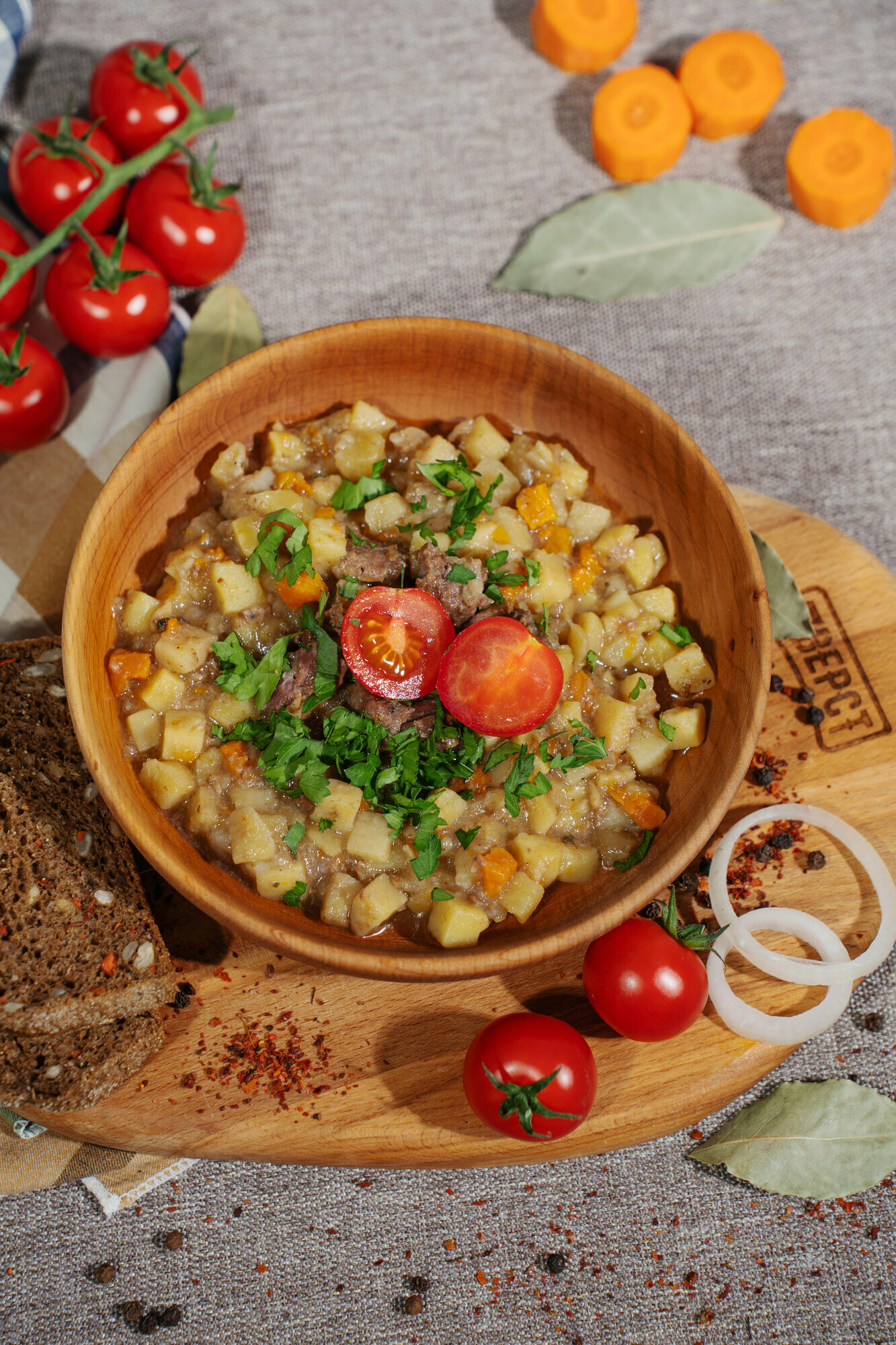 | Состав | Картофель свежий, говядина, лук репчатый свежий, морковь свежая, специи, масло растительное, томатная паста, соус кулинарный, соль |