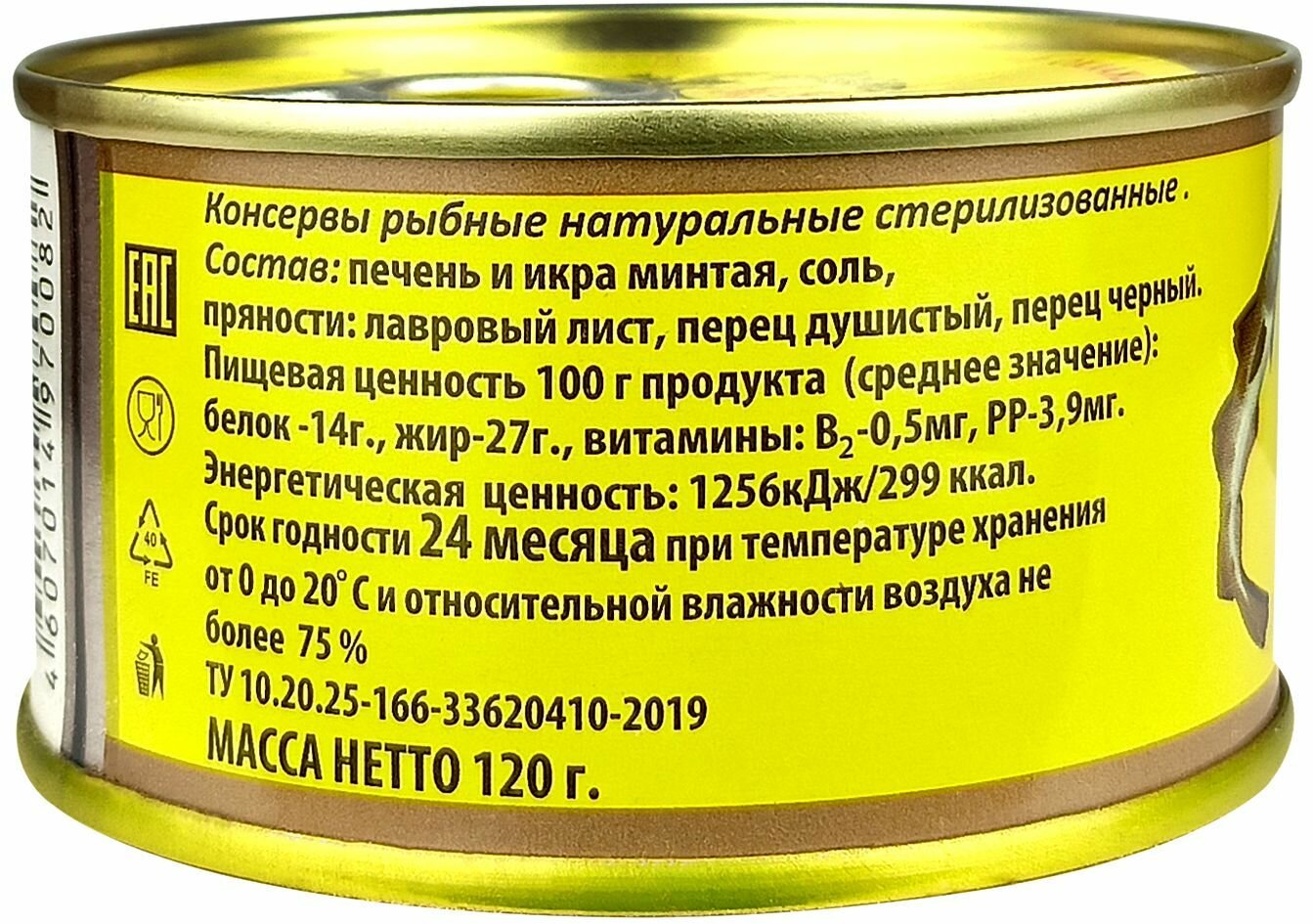 | Состав | Печень и икра минтая, соль, пряности: лавровый лист, перец душистый, перец черный. |
