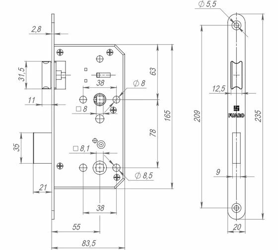 Замок врезной Fuaro DD.INOX/C-55.72