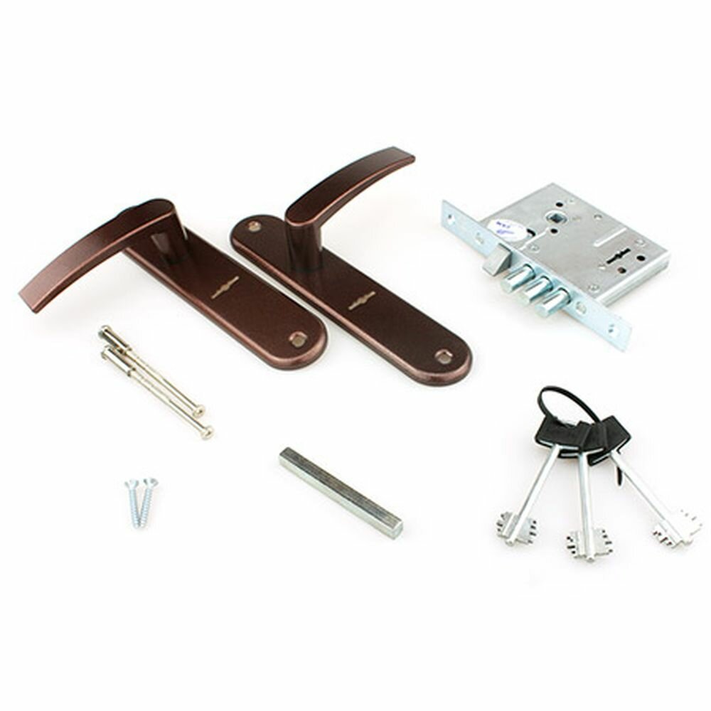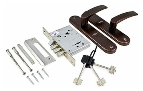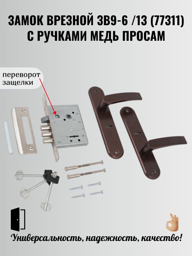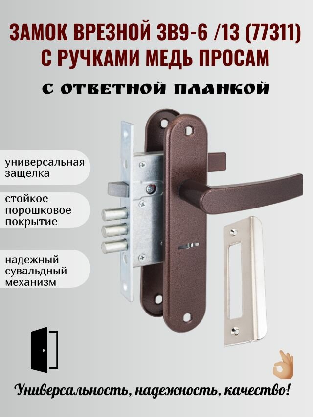 Замок врезной сувальдный ЗВ9-6 /13 (77311) в сборе с ручками медь, ответная планка просам (Рязань)