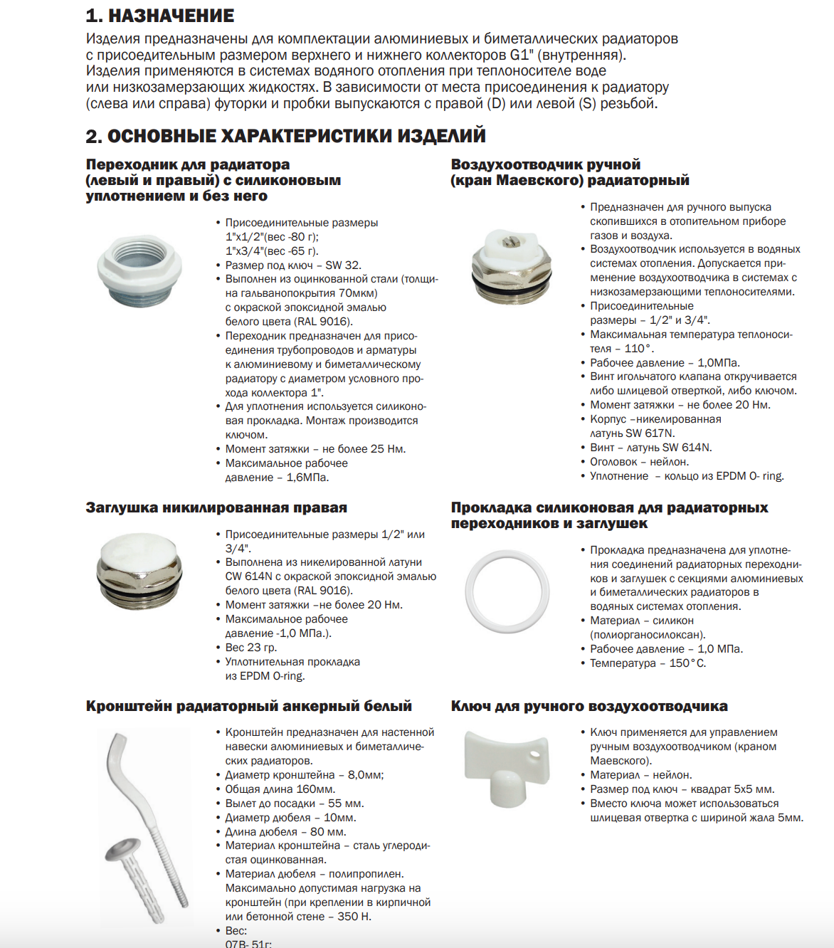 | Дополнительная информация | воздухоотводчик под отвертку – 1шт., заглушка – 1шт., воздухоотводчик под ключ – 1 шт., пробка правая – 2 шт., пробка левая – 2 шт., кронштейн – 2шт., дюбель – 2шт. |