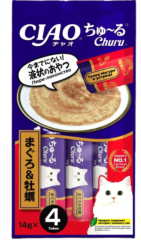Inaba Ciao Churu Лакомство для кошек в виде пюре из Тунца Магуро и Устрицы, 4*14 г.