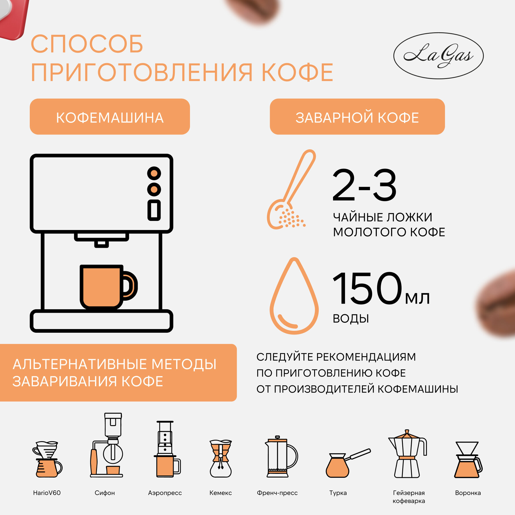 | Способ заваривания | аэропресс, гейзерная кофеварка (мока), джезва, кемекс, френч-пресс, чашка, эспрессо |