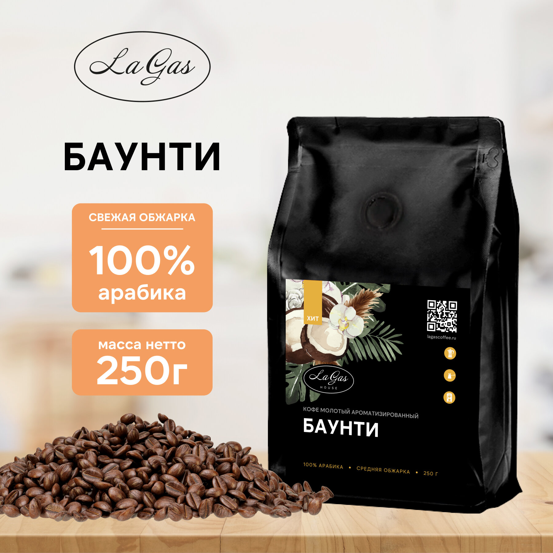 | Состав | 100% арабика, кофе натуральный, молотый |
