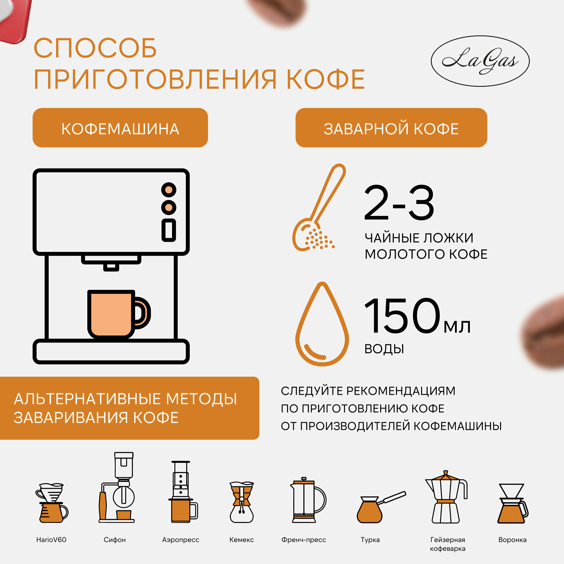 | Способ заваривания | аэропресс, гейзерная кофеварка (мока), джезва, кемекс, френч-пресс, чашка, эспрессо |